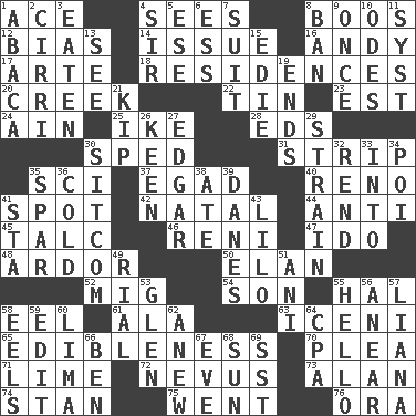 ACROSS 1. Adept person 4. Perceives with the eye 8. Scornful sounds 12. Prejudice 14. Come out of 16. "60 Minutes" Commentator Rooney 17. Johnson of "Laugh-In" 18. Dwellings 20. Small stream 22. Metal container 23. Eastern Standard Time (abbr.) 24. The 18th letter of the Arabic alphabet 25. Eisenhower's nickname 28. Begley and Asner 30. Drove too fast 31. Empty completely 35. _-fi 37. Mild oath 40. Western Nevada city 41. Blemish 42. Relating to or accompanying birth 44. Opposed to 45. Baby powder 46. Painter Guido (1575-1642) 47. Wedding promise 48. Zeal 50. Enthusiasm 52. Russian fighter aircraft 54. Male child 55. Actor Linden 58. Snakelike fish 61. Chicken ___ king 63. Ancient Celtic tribe of eastern Britain 65. The property of being fit to eat 70. Entreaty 71. Welles in "The Third Man" 72. Congenital growth or mark on the skin 73. Actor Alda or Thicke 74. Comedian Laurel of Laurel & Hardy 75. Gone 76. Mouth or opening DOWN 1. Phillipine bananalike plant 2. High-altitude cloud 3. Ingested 4. Title for a knight 5. Compass dir. 6. Double-curved letter 7. Costume for a special activity 8. Forbid 9. At one time in the past 10. Lyric poems 11. System (abbr.) 13. Observe 15. Singer Brickell 19. Extremities 21. Sleep 26. Peachy ____! 27. _ Allan Poe 29. Put through a sieve 30. "Cheers" or "Ellen" 32. Tear apart 33. To the inside or interior of 34. Luau course 35. Practice fight 36. Chilled 38. Had dinner 39. Natives or inhabitants of Denmark 41. R.R. building 43. _ and Stitch 49. Monetary unit of Yemen 51. Black tropical American cuckoo 53. Small, secluded valley 55. Phone greeting 56. Approach 57. Climbing, woody, usually tropical vines 58. Snakelike fish 59. Prepare for publication 60. Pale green bean 62. Afresh 64. Numbers guy (abbr.) 66. Benjamin's nick name 67. Night before a holiday 68. Player for Phoenix 69. Fast jet (abbr.)