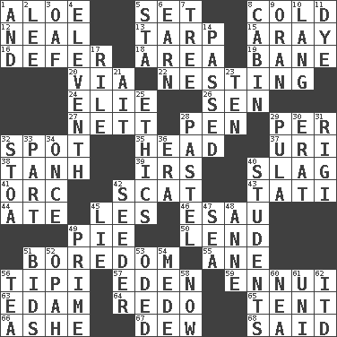 ACROSS 1. _ vera 5. Arrange properly for use 8. Chilled 12. Actress Patricia 13. Canvas cover 15. Like ___ of sunshine 16. Postpone 18. Type of rug 19. Object of repulsion 20. By way of 22. Snuggling 24. Writer Wiesel 26. Elected rep. 27. Remaining after all deductions 28. Fenced enclosure 29. For each 32. Specific locale 35. Froth on beer 37. RI univ. 38. Hyperbolic tangent 39. Big collection agency 40. Volcanic refuse 41. The grampus (Milton) 42. Leave at once 43. Jacques of French films 44. Had dinner 45. French article 46. Son of Isaac 49. Sliced dessert 50. Grant temporary use of 51. Mood resulting from idleness 55. One (Scot) 56. Native american tent (variation) 57. Genesis locale 59. World-weariness 63. Dutch treat 64. Do over again 65. Portable shelter 66. American tennis player Robert 67. Morning condensation 68. Stated DOWN 1. Also 2. Area sheltered from the wind 3. Clumsy lout 4. Veterans Day date 5. R.R. building 6. Merit 7. Woody plant 8. Small house or cottage 9. Northwest Algerian city 10. Long (Scottish) 11. Color 14. Went by 17. Cause heat under the collar 21. Small island 23. "___ Little Indians" 25. Principles of right and wrong 28. Soft color 29. Monetary unit of Botswana 30. Part of Q.E.F. 31. Swiss mountan, "Queen of the Mountains" 32. Portico 33. Component 34. Single time 36. Period 40. SAT takers 42. Sowing specialist 45. Untruth 47. Ocean 48. Singer Murray 49. A-one 51. Auction offers 52. Brightly colored fish 53. Wrote a lyric poem 54. Ancient Persian 56. Afternoon social gathering 58. At this time 60. Teachers' org. 61. Single; one (prefix) 62. It would