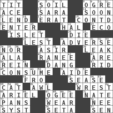 ACROSS 1. Teat (slang) 4. The visible part of the earth's surface 8. Legendary monster 12. Adept person 13. "Two Mules for Sister ____" 14. Within a short period 15. Grant temporary use of 17. Part of Q.E.F. 18. Continued (abbr.) 19. Keyboard key 21. Actor Linden 23. Environmental prefix 24. Small island 26. Expire 28. For fear that 30. Contrary to your interests or welfare 34. And not 37. SW Saudi Arabia district 39. Path through which fluid escapes 40. Wing 41. The wife of a rajah (variant) 43. "We ___ not amused" (Victoria) 44. It's straight from the horse's mouth 46. Mild oath, euphamism for damn 47. To free from 48. Eat 51. Assistant 54. Back 55. Gospel singer Marvin 58. Domesticated feline 61. Leather borer 63. Obtain by seizing forcibly or violently 65. Satellite of Uranus 67. Double curve, resembling the letter S 71. Nathan's nickname 72. Zero-star reviews 73. Erode 74. Born 75. System (abbr.) 76. Bristle 77. Elected rep. DOWN 1. Falsehood 2. Ancient Celtic tribe of eastern Britain 3. Portable shelters 4. Compass dir. 5. Rowing implement 6. Retirement account (abbr.) 7. Thin strip of wood or metal 8. Bear (Spanish) 9. Went 10. College mil. group 11. Inside; within (prefix) 16. Small valley 18. 154 in Roman numerals 20. To riddle 22. Increase 25. Russian ruler of old 27. Snakelike fish 29. Sadhe (variant) 30. Sports stadium 31. Located in or toward the back 32. Indian skirt 33. Supplemented with great effort 34. Drug cop 35. Butter sub 36. Precipitation 38. _ tizzy (2 wds.) 42. Armor plate that protects the chest 45. Science/research agcy. 49. Mountain range 50. Cut the grass 52. Morning condensation 53. Merit 56. Actors Connery and Penn 57. First name in cosmetics 58. Smile enhancers 59. Like ___ of sunshine 60. Airtight sealed metal containers 62. Coldest temperatures 64. Adolescent 66. Eastern Standard Time (abbr.) 68. Unit of force equal to gravity 69. Consume 70. Epoch
