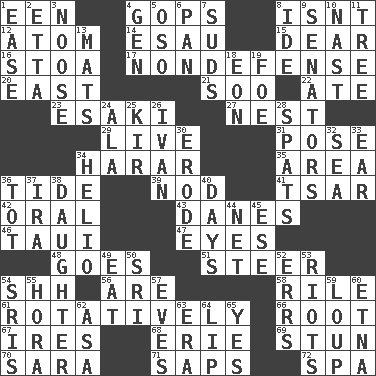 ACROSS 1. Car or cant ending 4. Republicans 8. Is not 12. Tiny particle 14. He sold his birthright 15. Letter starter 16. Portico 17. Unrelated to defense, as in spending 20. Compass direction 21. "Barney Miller" actor Jack 22. Had dinner 23. 1973 Nobel Price Winner (Physics) Leo 27. A home for chicks 29. Moving, as bait 31. Introduce or present, as a question 34. Ethiopian city, capital of Harari 35. Length times width 36. Periodic rise and fall of the sea level 39. Lower and raise head in agreement 41. Russian ruler of old 42. Taken by mouth 43. Natives or inhabitants of Denmark 46. "Change" in Tahitian 47. Snake ____ (dice throw) 48. Moves 51. Navigate 54. Quiet! 56. "We ___ not amused" (Victoria) 58. Cause heat under the collar 61. Rotating or pertaining to rotation 66. Carrot, for example 67. Angers 68. One of the Great Lakes 69. Astound 70. "Two Mules for Sister ____" 71. Plant excrements 72. Health resort DOWN 1. Relaxation 2. Singer James 3. Trap for birds or small mammals 4. Commissioned mil. rank 5. Bear (Spanish) 6. Baking dish 7. Soap bubbles 8. Binary compound 9. Elected representatives 10. Political cartoonist Thomas 11. Family _ (genealogy) 13. Floor coverings 18. A really long time 19. Enemy 24. According to 25. Apertif with cassis 26. _ the terrible 28. Arguments over trivial matters 30. Eat (away) 32. Ocean 33. Hearing organ 34. Sun: prefix 36. Small child 37. Lyricist Gershwin 38. Female offspring 40. 24-hour periods 44. Fish or hair follower 45. Compass dir. 49. Ingest 50. _ Lanka 52. Blunders 53. Debaucheries 54. Indian titles of respect 55. Israeli folk dance 57. Nights before holidays 59. Central Nebraska county 60. Inactive volcano in Sicily 62. White ___ sheet 63. Period 64. Mouth edge 65. Consenting reply