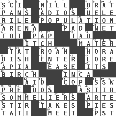 ACROSS 1. _-fi 4. Place where flour is made 8. Naughty child 12. Baking dishes 14. Goodbye (Sp.) 16. Ubangi River tributary 17. Cause heat under the collar 18. Census information 20. Sports stadium 22. Groovy apt. 23. Fish or hair follower 24. Small child 25. Infant food 28. Small boy 30. Hankering 31. Mother 35. Make lace 37. Wander aimlessly 40. Israeli folk dance 41. Food container 42. Keyboard key 44. Old wives' tales, e.g. 45. Capital of Western Samoa 46. Comfort 47. It is 48. A tree used for making furniture 50. South American Indian 52. Help 54. Police officer (slang) 55. Compass dir. 58. Before (prefix) 61. Two (Sp.) 63. Having gotten out of bed 65. Wine waiters 70. Johnson of "Laugh-In" 71. Move through with a circular motion 72. Proceeds 73. Sliced desserts 74. Jacques of French films 75. Rendezvous 76. Pacific Standard Time (abbr.) DOWN 1. Small fatty European fish 2. Capital of Egypt 3. An arm off of a larger body of water 4. Atlas unit 5. Wedding promise 6. Mouth edge 7. Central Nebraska county 8. On the contrary 9. It's straight from the horse's mouth 10. _ vera 11. Portable shelter 13. Elected rep. 15. Narrow board 19. First man 21. Fitting 26. Measure of real estate 27. Give a jingle 29. A pale violet or amethyst color 30. New York city 32. A blast of a horn 33. Blunders 34. Actress Charlotte 35. Native american tent (variation) 36. SW Saudi Arabia district 38. _ moment's notice (2 wds.) 39. Mesonic 41. Apply (a substance) by light strokes 43. Former U.S. Attorney General Janet 49. Flintstone garb 51. Numbers guy (abbr.) 53. Stupid person 55. Long narrow piece of something 56. Locates 57. Obtain by seizing forcibly or violently 58. Inconspicuous attention getter 59. Round or rotation of duties 60. Give off 62. Thailand, formerly 64. Plant excrement 66. Medical imaging device (abbr.) 67. Supplement with great effort 68. To separate or throw off 69. Fast jet (abbr.)