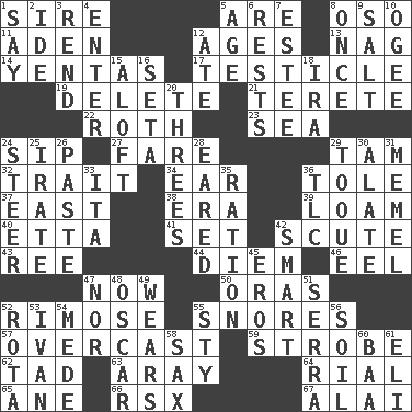 ACROSS 1. Beget 5. "We ___ not amused" (Victoria) 8. Bear (Spanish) 11. Arabian gulf 12. Matures 13. Tired old horse 14. Gossips 17. One of the two male reproductive glands 19. Erase 21. Cylindrical with tapered ends 22. Writer of Portnoy's Complaint (1969) 23. Ocean 24. Small drink 27. Conductor's collection 29. Scottish cap 32. Distinguishing feature 34. Ewer handle 36. Lacquered or enameled metalware 37. Compass direction 38. Period 39. Rich soil 40. Singer James 41. Put into a specified state 42. Scutum 43. Portuguese money of account (variant) 44. South Vietnam president (1954) 46. Snakelike fish 47. At this time 50. Mouths or openings 52. Full of chinks, cracks, or crevices 55. Sounds asleep 57. Cloudy 59. Disco prop 62. Small amount or degree 63. Like ___ of sunshine 64. Monetary unit of Yemen 65. One (Scot) 66. Acura sports coupe 67. Jai ____ DOWN 1. Declare 2. Binary compound 3. Tear apart 4. Keyboard key 5. Ripen 6. Musical pauses 7. First name in cosmetics 8. Single time 9. Table seasoning 10. Double curve, resembling the letter S 12. Had dinner 15. Upward 16. Stalk of a moss capsule 18. Lyricist Gershwin 20. Threesomes 24. Bull 25. Feeling or showing extreme anger 26. Thick mixture 28. Having ears or earlike features 29. Woman's close-fitting hat 30. Having winglike extensions 31. Klaipeda city 33. Call ___ day 35. Food allowance for one day 36. Affectionate concern, for short 42. Don Adams' spy role 45. Greek god of love 47. And not 48. Witty Wilde 49. Erodes 51. Spanish missionary in California 52. Roll call or roster of names 53. "Terrible" tsar 54. Ancient Persian 55. Filthy place 56. Land 58. Saxophone 60. Sound made by sheep 61. Connecticut Ivy Leaguer