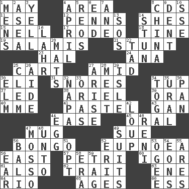 ACROSS 1. Fifth month 4. Length times width 8. Music discs 11. Compass dir. 12. Actor Sean's family 14. "______ My Girl" (Turtles hit) 15. 1994 drama film starring Jodie Foster 17. Cowboy competition 18. Prong on a fork 19. Deli grouping 21. Check the growth or development of 23. Actor Linden 24. Santa ___, CA 25. Heavy open wagon 27. Among 30. Biblical high priest 31. Sounds asleep 34. Uncastrated adult male sheep 37. Directed 38. Satellite of Uranus 39. Mouth or opening 40. Madame (abbr.) 41. Soft color 43. Separate the seeds from cotton 44. Relaxation 45. Taken by mouth 47. Large cup 49. Institute legal proceedings 50. Beat drum 52. Normal relaxed breathing 56. 90 degrees 57. _ dish (used to culture cells) 60. Russian composer Stravinsky 61. In addition 62. Distinguishing feature 63. Compass dir. 64. _ de Janeiro 65. Matures 66. Double-curved letter DOWN 1. Not women's 2. Toward the sea 3. Shout 4. Showery time 5. Vintage cars 6. Conclusion 7. A saturated hydrocarbon 8. Large country 9. Gouge 10. Compass dir. 13. Distress signal 14. Surprise greatly 16. Cowardly lion portrayer 20. Floor coverings 22. Small amount or degree 25. To starve (Brit.) 26. Assistant 27. Originate 28. Rendezvous 29. Small island 30. Shade tree 32. California wine valley 33. Mouths or openings 34. Ancient Roman robe 35. Mountain range 36. Baking dish 42. Central Nebraska county 44. Oval reproductive body of a fowl 46. Painter Guido (1575-1642) 47. With motion or animation 48. To (old English) 49. Costumes for special activities 50. Indonesian resort city 51. Elect 52. One of the Great Lakes 53. Double curve, resembling the letter S 54. Immeasurably long periods of time 55. Ancient Greek god of war 56. Hearing organ 58. Period 59. Label