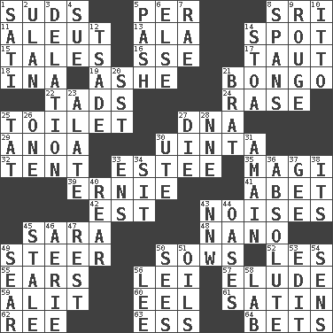 ACROSS 1. Beer foam 5. For each 8. Indian title of respect (Mr.) 11. Eskimo relative 13. Wing 14. Blemish 15. Lies 16. Compass dir. 17. Pulled tight 18. _ tizzy (2 wds.) 19. American tennis player Robert 21. Beat drum 22. Small amounts or degrees 24. To erase 25. Rest room 27. Heredity factor (abbr.) 29. Small Philippine buffalo 30. National forest in Provo, Utah 32. Portable shelter 33. First name in cosmetics 35. Wise men 39. Bert's buddy 41. Collude with 42. Eastern Standard Time (abbr.) 43. Annoying sounds 45. "Two Mules for Sister ____" 48. Billionth: prefix 49. Navigate 50. Sty mamas 52. French article 55. Hearing organs 56. Luau accessory 57. Dodge 59. Set down 60. Snakelike fish 61. Smooth fabric 62. To riddle 63. Curvy letter 64. Antes DOWN 1. Suttee (variant) 2. ____ Bator, Mongolia 3. Conveyance 4. Take to court 5. Romantic infatuation 6. Otherwise 7. Actress Charlotte 8. Connects, as a bridge 9. Makeup applied to the cheeks 10. "Tell ____ the Marines!" 12. Sadhe (variant) 14. Portico 20. Fast jet (abbr.) 21. Naughty child 23. Having winglike extensions 25. Make lace 26. Single 27. Pass on 28. Compass dir. 30. Shoshoni 31. With great haste 33. Followers of ems 34. Be seated 36. Utter; complete 37. Unit of force equal to gravity 38. ___ a Wonderful Life 40. Bring up, as a child 43. Compass dir. 44. Fertile tracts in a desert 45. Lacking originality or spontaneity 46. Nest on high 47. Take ten 49. Burn superficially 50. Perceives with the eye 51. Petroleums 53. Prepare for publication 54. Elected reps. 56. Area sheltered from the wind 58. Experiment locale