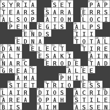 ACROSS 1. Damascus' land 6. Put into a specified state 9. Infant food 12. Separates forcefully 13. "Two Mules for Sister ____" 14. Blunders 15. Columnist Joseph or Stewart 16. Smallest unit of an element 17. Locales 18. Writing instrument 19. The front part of a cuirass 20. High mountains 21. Extremities 23. One more than two 24. Pulitzer Prize-winning author Ferber 25. "_____ Recall" 28. One of the 12 tribes of Israel 30. Voters do this 34. Hoop that covers a wheel 35. The first octave above the treble staff 36. 1973 Nobel Price Winner (Physics) Leo 38. The 18th letter of the Arabic alphabet 39. Drug cop 41. Eat (away) 43. Small amount or degree 44. Relatively large 46. Toward shelter 48. Housemaid (var.) 49. Silvers or Donahue 50. Proofreading order 51. Musical group of three 53. Curvy letter 56. Den 57. "Vaya con ____" 58. Bitter 60. Length times width 61. Brightly colored fish 62. Vertical member of a panel or frame 63. Altar cloth linen 64. Direct toward a target or goal 65. NE Netherlands city DOWN 1. R.R. building 2. Sharp bark 3. Raze (variant) 4. Pressed 5. Viper 6. Suttee (variant) 7. Greek god of love 8. Scottish cap 9. Conciliate 10. Arches 11. Air pressure measure (abbr.) 13. Settles 14. American author Paul (1891-1958) 19. Peak District village in England 20. Small island 22. Compass dir. 24. Pleas 26. Operatic vocal solo 27. Grant temporary use of 28. Mild oath, euphamism for damn 29. Having or resembling wings 31. Compass dir. 32. Auto 33. Ring climax 37. Potato state 40. Device for capturing images 42. Biblical high priest 45. Make lace 47. Opts 49. Expression of disdain 50. Indian skirt 51. Native american tent (variation) 52. Wander aimlessly 54. Indian titles of respect 55. Drop; flow; fall 56. Experiment locale 57. ___ good deed 58. White ___ sheet 59. Lair