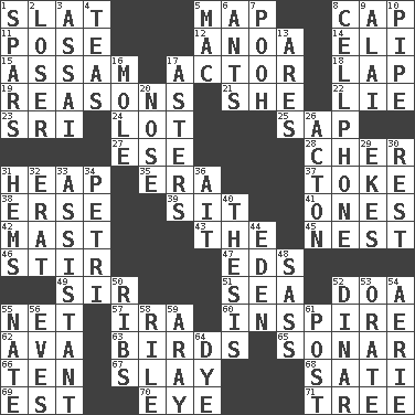 ACROSS 1. Narrow board 5. Atlas unit 8. Head covering 11. Introduce or present, as a question 12. Small Philippine buffalo 14. Connecticut Ivy Leaguer 15. Indian state 17. Thespian 18. Pet locale 19. Thinks logically 21. A female animal or person 22. Falsehood 23. _ Lanka 24. Car dealer's back yard 25. Plant excrement 27. Compass dir. 28. "Mermaids" star 31. Pile 35. Epoch 37. Casino tip 38. Celtic language 39. Be seated 41. Washington bills 42. Vertical spar for supporting sails 43. Definite Article 45. A home for chicks 46. Use a swizzle stick 47. Begley and Asner 49. Title for a knight 51. Ocean 52. ___ good deed 55. Fish or hair follower 57. Lyricist Gershwin 60. Motivate 62. Actress Gardner 63. Avian creatures 65. Echolocation 66. Nine, plus one 67. Kill 68. Suttee (variant) 69. Eastern Standard Time (abbr.) 70. Sight organ 71. Woody plant DOWN 1. Practice fights 2. Failure 3. Slender Brazilian palm 4. Beverages made from leaves 5. Big _ 6. Pismires 7. "Silly old bear" 8. Portable communications device 9. Mountain range southwest of Kyrgyzstan 10. Corncob 13. Ancient Greek god of war 16. Undercover agent 17. Michaelmas daisies 20. Olfactory organ 26. NE Massachussets city 29. Supplements with great effort 30. Relief 31. Equivocates 32. Part of Q.E.F. 33. Aide 34. _ dish (used to culture cells) 36. Small island 40. College paper 44. Paradise 48. Backtalk 50. Teases 52. Middle Eastern gold or silver currency 53. Speak pompously 54. Nest on high 55. Nathan's nickname 56. Nights before holidays 58. Cause heat under the collar 59. Like ___ of sunshine 61. Mail 64. Color