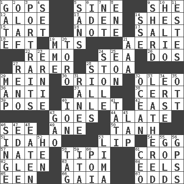 ACROSS 1. Republicans 5. Trig term 9. A female animal or person 12. Medicinal plant 13. An important port of Yemen 14. "______ My Girl" (Turtles hit) 15. Small pie 16. Short letter 17. Table seasoning 18. Lizard (obsolete) 19. Mountains (abbr.) 21. Nest on high 22. San ____ (Riviera town) 24. Ocean 26. Two (Sp.) 27. More uncommon 28. Portico 29. Chow _ 30. Constellation of myth 32. Butter sub 36. Against 37. Everything 38. Sure thing 39. Airs 40. An arm off of a larger body of water 42. Compass direction 43. Travels 44. Having winglike extensions 46. Perceive with the eye 49. A saturated hydrocarbon 50. Hyperbolic tangent 51. Potato state 53. Mouth edge 54. Ovum 57. Nathan's nickname 58. Native american tent (variation) 61. Riding implement 62. Small, secluded valley 63. Tiny particle 64. Snakelike fish 65. Car or cant ending 66. Greek goddess of the earth (variant) 67. Probability DOWN 1. Yard entry 2. Norwegian king 3. Likenesses of persons 4. Put into a specified state 5. Without 6. Wedding promise 7. Fish or hair follower 8. Compass dir. 9. Pottery fragment 10. Sun: prefix 11. _____ Park, CO 14. Compass dir. 19. Madame (abbr.) 20. "Corrida" creature 21. American Automobile Association (abbr.) 23. Bert's buddy 24. Took without asking 25. Age 27. Former U.S. Attorney General Janet 28. Beverly of Met fame 29. Atlas unit 31. Indian princess (variant) 32. Sea 33. Tough but pliablecoriaceous 34. Celtic language 35. Baseball player Mel 40. Electrically charged atom 41. Jacques of French films 43. E Mali city 45. Pet locale 46. Burn superficially 47. Peak District village in England 48. Eroded 52. Layer 53. Pale green bean 55. Gilded 56. Global Positioning Systems (abbr.) 58. Label 59. Call ___ day 60. Luau course 61. Corporate head (abbr.)