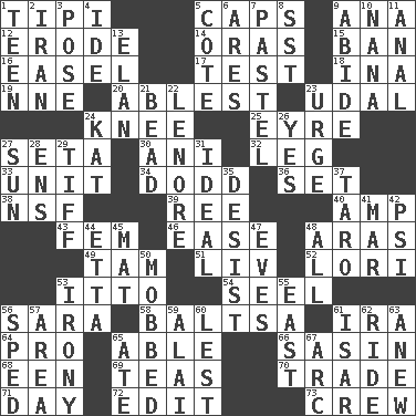 ACROSS 1. Native american tent (variation) 5. Balmoral and tarboosh 9. Santa ___, CA 12. Eat (away) 14. Mouths or openings 15. Prohibit 16. Artist's stand 17. Trial 18. _ tizzy (2 wds.) 19. Compass dir. 20. Most capable 23. Freehold land 24. Leg joint 25. Jane of fiction 27. Bristle 30. Black tropical American cuckoo 32. Part of a journey 33. A single undivided whole 34. Texas town _ City 36. Arrange properly for use 38. Overdraft (abbr.) 39. Portuguese money of account (variant) 40. Electrical Unit 43. Opposite of masc. 46. Relaxation 48. Caspian sea tributary 49. Scottish cap 51. 54 in ancient Rome 52. Australian parrot (variant) 53. "Tell ____ the Marines!" 54. Stitch closed the eyes of (a falcon) 56. "Two Mules for Sister ____" 58. Greek mezzo-soprano Agnes 61. Lyricist Gershwin 64. Adept person 65. Competent 66. Indian antelope 68. Car or cant ending 69. Afternoon social gatherings 70. Exchange 71. 24 hours 72. Prepare for publication 73. Group working together DOWN 1. Adolescent 2. SW Asia republic 3. Introduce or present, as a question 4. Binary compound 5. ____ d'Azur (French Riviera) 6. Ancient Greek god of war 7. Soft color 8. Fast jet (abbr.) 9. Remain 10. Nanny 11. Of or related to the anus 13. Flair 21. Necklace unit 22. Poe poem 23. Goad 24. Krazy ___ of comics 26. It is so 27. Player for Phoenix 28. Followers of ems 29. Small quarrel 31. Perfect 35. Cease 37. Pacific island yam 41. Impair 42. 23rd letter of the Greek alphabet 44. Singer James 45. Floor protector 47. Nights before holidays 48. Everything 50. Crowded into 53. Literary sarcasm 55. Compass direction 56. Drove too fast 57. Length times width 59. Jai ____ 60. For fear that 61. Austrian river, tributary to the Danube 62. Travel on or in a vehicle 63. Afresh 65. Had dinner 67. Curve