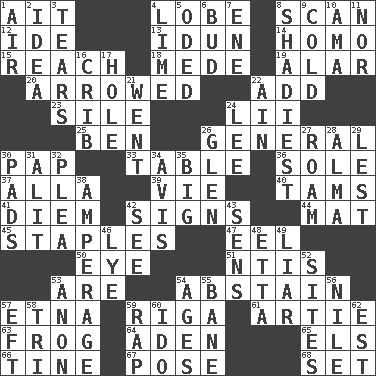 ACROSS 1. Small island 4. Ear part 8. Examine hastily 12. Binary compound 13. Goddess of spring and wife of Bragi 14. Like (prefix) 15. Arrive at 18. Ancient Persian 19. Having or resembling wings 20. Moved like an arrow 22. Find the sum of 23. Filth; sediment 24. Cards in a Roman deck? 25. Benjamin's nick name 26. Commissioned military rank 30. Infant food 33. Eating place 36. Flatfish 37. Silent film actress Nazimova 39. Compete 40. Scottish caps 41. South Vietnam president (1954) 42. Omens 44. Floor protector 45. Paper fasteners 47. Snakelike fish 50. Sight organ 51. Nuclear Threat Initiatives 53. "We ___ not amused" (Victoria) 54. Choose not to consume 57. Inactive volcano in Sicily 59. Capital of Latvia 61. Nick name for Arthur 63. Tree-dwelling hopper 64. Arabian gulf 65. Raised railways 66. Prong on a fork 67. Introduce or present, as a question 68. Put into a specified state DOWN 1. Atmosphere 2. The main thing one is thinking about 3. Pulls apart 4. Welles in "The Third Man" 5. Wrote a lyric poem 6. Partially opened flower 7. Compass dir. 8. Most dubious of character or honesty 9. Lacking warmth 10. Housemaid (var.) 11. And not 16. Baby bed with high sides 17. Opening into or through something 21. Gone 22. The 18th letter of the Arabic alphabet 24. Area sheltered from the wind 26. Small, secluded valley 27. Wander 28. _ mater 29. For fear that 30. Groovy apts. 31. Set down 32. Entreaty 34. Advice 35. Massive 38. Electrical Measurement 42. Observe 43. Elected reps. 46. Sodium hydroxide 48. Singer James 49. One who doesn't tell the truth 52. Locates 53. At once, immediately (arch.) 54. Eons 55. Object of repulsion 56. The longest river in the world 57. Bank Draft (abbr.) 58. Three (prefix) 59. Reproach for some lapse or misdeed 60. Wedding promise 62. Eastern Standard Time (abbr.)