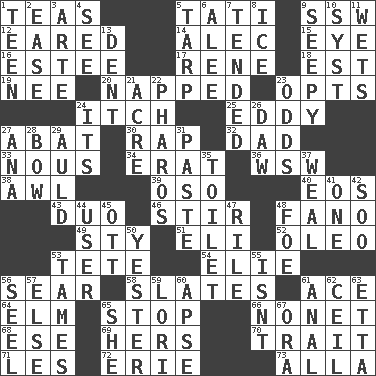 ACROSS 1. Beverages made from leaves 5. Jacques of French films 9. Compass dir. 12. Having ears or earlike features 14. Actor Baldwin 15. Sight organ 16. First name in cosmetics 17. French philosopher Descartes 18. Eastern Standard Time (abbr.) 19. Born 20. Slept 23. Elects 24. Hankering 25. Whirlpool 27. Blind as ____ 30. Reproach for some lapse or misdeed 32. June honoree 33. Good sense 34. Part of Q.E.F. 36. Compass dir. 38. Leather borer 39. Bear (Spanish) 40. Greek goddess of the dawn 43. Superhero pair 46. Use a spoon 48. Papal veil 49. Filthy place 51. Biblical high priest 52. Margarine 53. False hair 54. Writer Wiesel 56. Shrivel 58. Chalkboards 61. Adept person 64. Shade tree 65. Constrict 66. Music written for nine 68. Compass dir. 69. Possessive pronoun 70. Distinguishing feature 71. French article 72. One of the Great Lakes 73. Silent film actress Nazimova DOWN 1. Adolescent 2. Relaxation 3. Johnson of "Laugh-In" 4. Perceive with the eye 5. Canvas cover 6. Toward shelter 7. Looked after 8. Frozen water 9. Oozy 10. System (abbr.) 11. Soaks 13. Scratch 21. 43,560 square feet 22. N Egypt peninsula 23. Likelihood 24. ___ a Wonderful Life 26. Simpleton 27. Santa ___, CA 28. Ribbon knot 29. Old (Scot.) 31. Thick mixture 35. Rest room 37. Welt 41. Single 42. "Barney Miller" actor Jack 44. One who makes use of a thing 45. Baseball player Mel 47. Cause heat under the collar 48. Enemy 50. Last past 53. Domesticates 55. Is not 56. Sew up the eyelids of hawks and falcons 57. Otherwise 59. Australian parrot (variant) 60. Domed church section 61. Of or related to the anus 62. To provide with a ceiling 63. Singer James 65. A female animal or person 67. Mouth or opening