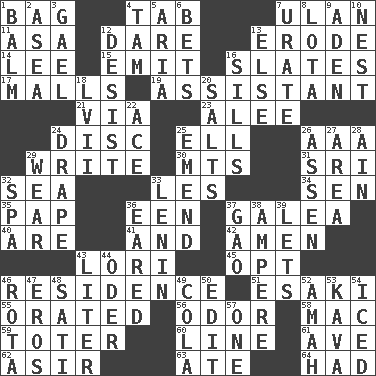 ACROSS 1. Paper or plastic container 4. Keyboard key 7. ____ Bator 11. White ___ sheet 12. Have the gumption 13. Eat (away) 14. Area sheltered from the wind 15. Give off 16. Chalkboards 17. Promenades 19. Aide 21. By way of 23. Toward shelter 24. Plate 25. Pipe bend 26. American Automobile Association (abbr.) 29. Compose 30. Mountains (abbr.) 31. Indian title of respect (Mr.) 32. Ocean 33. French article 34. Elected rep. 35. Infant food 36. Car or cant ending 37. An organ shaped like a helmet 40. "We ___ not amused" (Victoria) 41. Added to 42. So be it 43. Australian parrot (variant) 45. Choose 46. Dwelling 51. 1973 Nobel Price Winner (Physics) Leo 55. Spoke pompously 56. Scent 58. Apple computer (short form) 59. Carrier 60. Actor's bit 61. "___ Maria" 62. SW Saudi Arabia district 63. Had dinner 64. Possessed DOWN 1. Lip ointment 2. Toward the sea 3. Highlander 4. Scottish cap 5. Operatic vocal solo 6. Wagers 7. A salt of uric acid 8. Globular water bottle used in Asia 9. Arabian gulf 10. Egg locale 12. Stop 13. Otherwise 16. Beverly of Met fame 18. 57 in ancient Rome 20. Table seasonings 22. Adept person 24. Window treatment 25. Make improvements or corrections to 26. NE Netherlands city 27. Type of rug 28. The 18th letter of the Arabic alphabet 29. Erode 32. Health resort 33. Soviet premier 1918-24 36. Having ears or earlike features 37. E Mali city 38. Electrical Unit 39. Allows 43. 61 cubic inches 44. River in Europe 46. Round or rotation of duties 47. Greek god of love 48. Suttee (variant) 49. Root beer relative 50. Prepare for publication 52. Nanny 53. Polynesian shrub of the pepper family 54. On the rocks 57. Single