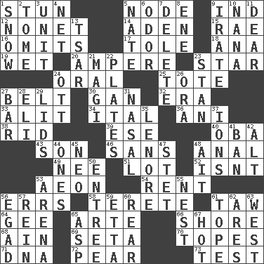 ACROSS 1. Astound 5. Connecting point 9. Working for oneself (abbr.) 12. Music written for nine 14. Arabian gulf 15. Actress Charlotte 16. Leaves out 17. Lacquered or enameled metalware 18. Santa ___, CA 19. Dripping 20. Electrical Unit 23. Play the lead 24. Spoken 25. Haul 27. Waist strap 30. Separate the seeds from cotton 32. Epoch 33. Came down and settled, as after flight 34. Slanted text style (abbr.) 36. Black tropical American cuckoo 38. To free from 39. Compass dir. 40. Chief or king in Benin or Nigeria 43. Male offspring 46. Without 48. Of or related to the anus 49. Born 51. Car dealer's back yard 52. Is not 53. A really long time 54. Monthly bill 56. Blunders 58. Cylindrical with tapered ends 61. The 23rd letter of the Hebrew alphabet 64. Unit of force equal to gravity 65. Johnson of "Laugh-In" 66. Dinah or Pauly 68. The 18th letter of the Arabic alphabet 69. Stalk of a moss capsule 70. Drinks excessively 71. Heredity factor (abbr.) 72. Lightbulb-shaped fruit 73. Trial DOWN 1. Frozen precipitation 2. Heavy book 3. A single undivided whole 4. Fish or hair follower 5. Nathan's nickname 6. Scent 7. Erase 8. Compass dir. 9. Feeling or showing extreme anger 10. Nanny 11. Letter starter 13. Russian ruler of old 21. Wise men 22. Food holders 23. Comedian Laurel of Laurel & Hardy 24. Baseball player Mel 26. Mouth or opening 27. Drinking establishment 28. Biblical high priest 29. Flaplike coverings 31. Rhinal 35. Poe poem 37. Charged particles 41. Forbid 42. Keyboard modifier key 44. Singles 45. Modern: prefix 47. Proofreading order 48. Small island 50. Main course 53. Sports stadium 55. A home for chicks 56. Mild oath 57. It's straight from the horse's mouth 59. Singer James 60. Buttocks 61. Drink excessively 62. Ancient Greek god of war 63. Compass direction 65. Cleo's killer 67. Being at a high temperature