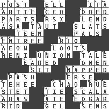 ACROSS 1. Mail 5. Pipe bend 8. Call ___ day 11. Nick name for Arthur 13. Corporate head (abbr.) 14. Wrote a lyric poem 15. Actors' quests 16. Acura sports coupe 17. Grant temporary use of 18. White ___ sheet 19. Pulled tight 21. Narrow boards 22. Adolescent 24. Friends 25. Main course 27. _ de Janeiro 29. Period of immesurable duration 30. Plunders 32. Painter Guido (1575-1642) 33. The state of being joined or united 35. Falsehood 39. Having ears or earlike features 41. Presage 42. Be seated 43. Slept 45. Romantic infatuation 48. Celtic language 49. Giggle 50. US Secretary of Labor Elaine L. _ 52. Regret 55. Proofreading order 56. Make a knot 57. Any of the three canals of the cochlea 59. Caspian sea tributary 60. Had dinner 61. _ Allan Poe 62. To free from 63. Set 64. Elected reps. DOWN 1. Dad 2. Mouths or openings 3. Ski resort town in Vermont 4. Teat (slang) 5. Shade of tan 6. For fear that 7. Brine-cured salmon 8. Perfect 9. Portable shelters 10. Sums up 12. First name in cosmetics 14. Water jar 20. A saturated hydrocarbon 21. Blemish 23. Bert's buddy 25. Ewer handle 26. Born 27. Friend of Pooh 28. Electrically charged atom 30. Hat (slang) 31. Halts 33. RI univ. 34. Fish or hair follower 36. Electrical Measurement 37. Area sheltered from the wind 38. Conclude 40. American tennis player Robert 43. Teachers' org. 44. Came up 45. _ dish (used to culture cells) 46. At or in the front 47. Arranges properly for use 49. Russian ruler of old 50. Quote 51. Person who is morally reprehensible 53. ____ Bator 54. Hearing organs 56. Label 58. Music discs