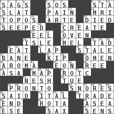 ACROSS 1. Settles 5. Distress signal 8. R.R. building 11. Narrow board 12. Ache 14. Medical imaging device (abbr.) 15. Traditional theme or motif 17. Johnson of "Laugh-In" 18. Passed on 19. Oozed 21. Cause to be 23. Snakelike fish 25. Baking chamber 26. Small island 27. Cartoonist voice _ Blanc 28. Small amount or degree 31. Ingest 33. Pet locale 35. Lacking originality or spontaneity 37. Object of repulsion 38. Sleep 40. Sign of something about to happen 41. Odor 43. Age 45. Portuguese money of account (variant) 46. White ___ sheet 47. Atlas unit 50. College mil. group 52. Delicate 53. Third day of the wk. 54. Right away 56. Sounds asleep 61. Alleged 62. Slanted text style (abbr.) 65. Exchange 66. Conclusion 67. Roll call or roster of names 68. At sea 69. Compass dir. 70. Saxophone 71. Elected reps. DOWN 1. Fast planes 2. Medicinal plant 3. Stare wonderingly 4. Discontinue 5. Health resort 6. Boat paddle 7. "Cheers" or "Ellen" 8. Stricken, poetically 9. Relationship diagram 10. Assist 13. Boldness 16. Observes 18. One of the 12 tribes of Israel 20. Small valley 22. Snakelike fish 24. Path through which fluid escapes 26. A distinct part 28. Docile 29. Toward shelter 30. Lair 31. Hearing organs 32. Small Philippine buffalo 34. Sliced dessert 36. Torque (variant) 37. Sound made by sheep 39. Sweet dark-red dessert wine 42. So be it 44. Horse sense 48. Being in motion 49. Pictures 51. Portable shelter 52. Allow head to fall sleepily 54. Zero-star reviews 55. Travel on or in a vehicle 57. Mouths or openings 58. To erase 59. Locale of original sin 60. Oceans 61. Observe 63. "One Day ___ Time" 64. Not strict