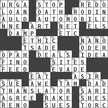 ACROSS 1. Capital and largest city of Mongolia 5. Constrict 9. Make new 13. Grant temporary use of 14. Pledge 15. "The Thinker" sculptor 16. Old (Scot.) 17. Car 19. Compass dir. 20. Nonscientific branch of learning 21. Fish or hair follower 22. Raised railways 23. Moist 25. And so on (abbr.) 26. Value system 30. Billionth: prefix 34. Sadhe (variant) 35. River in Europe 36. Brightly colored fish 39. Allots cards 42. The content of cognition 43. Fine (Spanish) 44. Locates 46. Nourish 47. Dodge 48. Erode 51. SW Saudi Arabia district 54. Take to court 57. Deep reverence 58. Scottish cap 60. June honoree 62. Interpreter 65. Indian skirt 66. Match 67. Immoral or dissolute person 68. "______ My Girl" (Turtles hit) 69. Western Nevada city 70. Takes to court 71. Torque (variant) DOWN 1. ____ Bator 2. Unit of ammunition 3. An organ shaped like a helmet 4. Added to 5. Fly high 6. Strained 7. Baseball player Mel 8. Give a jingle 9. Director Reiner 10. Singer Brickell 11. Deli pickle 12. Washington bills 15. College mil. group 18. Was introduced to 20. Tenement units (abbr.) 24. Mode 27. Possessed 28. Binary compound 29. Desist 30. Annoying sounds 31. Find the sum of 32. Born 33. Mouth or opening 36. No longer planned or scheduled 37. Sliced dessert 38. One (Scot) 40. 54 in ancient Rome 41. R.R. building 45. Dutch treat 48. Comfort 49. Leather borer 50. Pulls apart 52. Potato state 53. Less widely known 54. Play the lead 55. Goad 56. Merit 58. Casino tip 59. Ancient Greek god of war 61. Plate 63. Modern: prefix 64. The 19th letter of the Greek alphabet 65. Fast jet (abbr.)