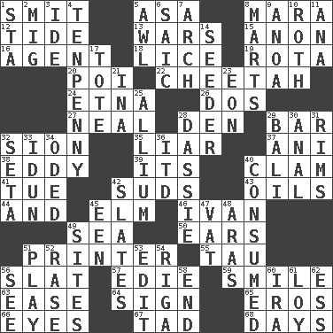 ACROSS 1. Stricken, poetically 5. White ___ sheet 8. Hindu Mythology: god of death 12. Periodic rise and fall of the sea level 13. Armed conflicts 15. At once, immediately (arch.) 16. Representative 18. Louse (plural) 19. Roll call or roster of names 20. Luau course 22. Leopard's kin 24. Inactive volcano in Sicily 26. Two (Sp.) 27. Be tempered by heat 28. Lair 29. Soap unit 32. The Jewish people; Israel 35. One who doesn't tell the truth 37. Black tropical American cuckoo 38. Whirlpool 39. It is 40. Burrowing marine mollusk 41. Third day of the wk. 42. Soap bubbles 43. Petroleums 44. Also 45. Shade tree 46. "Terrible" tsar 49. Ocean 50. Hearing organs 51. Hard copy producer 55. The 19th letter of the Greek alphabet 56. Narrow board 57. Singer Brickell 59. Grin 63. Relaxation 64. Signal 65. Greek god of love 66. Snake ____ (dice throw) 67. Small boy 68. 24-hour periods DOWN 1. R.R. building 2. Russian fighter aircraft 3. Binary compound 4. 3-inch nail 5. Leather borer 6. Ketch in the Levant 7. Bowlike part 8. Shops 9. Small Philippine buffalo 10. Writer of Portnoy's Complaint (1969) 11. Santa ___, CA 14. Sowing specialist 17. Lug 21. _ tizzy (2 wds.) 23. Age 25. Plant genus of onion and garlic 28. Small ungulate mammals of Africa 29. Indonesian resort city 30. Of or related to the anus 31. Basketball hoops 32. Stalk of a moss capsule 33. Goddess of spring and wife of Bragi 34. Wrote a lyric poem 36. It would 40. Ingested 42. Chalkboards 45. Car or cant ending 47. Large container 48. Ancient river in northeast Turkey 49. Locates 51. Shaw product 52. To erase 53. Prepare for publication 54. Port city in Latvia 56. Observe 58. Conclude 60. Lyricist Gershwin 61. Myrna of the movies 62. Curvy letter