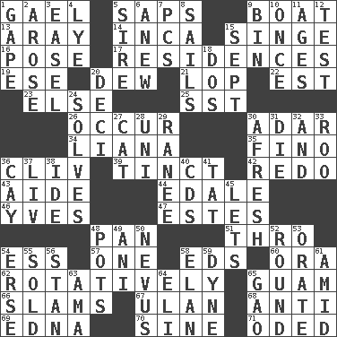 ACROSS 1. Highlander 5. Plant excrements 9. Water vessel 13. Like ___ of sunshine 14. South American Indian 15. Burn superficially 16. Airs 17. Homes 19. Compass dir. 20. Morning condensation 21. Chop off 22. Eastern Standard Time (abbr.) 23. Otherwise 25. Fast jet (abbr.) 26. Happen 30. The sixth month of the Jewish calendar 34. Woody, climbing, usually tropical plant 35. A pale, very dry sherry 36. 154 in Roman numerals 39. Tinged 42. Make new 43. Assistant 44. Peak District village in England 46. Jacques Cousteau's middle name 47. _____ Park, CO 48. Baking dish 51. Through, poetically 54. Double-curved letter 57. Single 58. Begley and Asner 60. Mouth or opening 62. Producing rotation 65. Island territory of the United States 66. Shuts with force 67. ____ Bator 68. Opposed to 69. Pulitzer Prize-winning author Ferber 70. Trig term 71. Wrote a lyric poem DOWN 1. Yawn 2. Came up 3. Artist's stand 4. Sodium hydroxide 5. Father 6. Afresh 7. Personal Computers (abbr.) 8. Travel by water 9. Storage container 10. Single time 11. Matures 12. Trial 15. Back-to-school mo. 18. Two (Sp.) 20. Tenth: prefix 24. Finds the solution 27. Domesticated feline 28. University (slang) 29. Indian princess (variant) 30. Anew 31. Expire 32. Also 33. Friend of Pooh 36. Island 37. 54 in ancient Rome 38. Binary compound 40. Music discs 41. Make lace 45. Allows 48. Cooking vessels 49. Black tropical American cuckoo 50. Mole, birthmark 52. Unit of ammunition 53. Declaim 54. Celtic language 55. Disposed of to a purchaser 56. Comedian Laurel of Laurel & Hardy 58. Enthusiasm 59. Centimeter-gram-second unit of force 61. Among 63. Nanny (var.) 64. Connecticut Ivy Leaguer 65. E Mali city