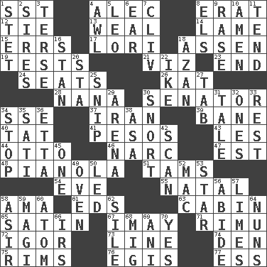 ACROSS 1. Fast jet (abbr.) 4. Actor Baldwin 8. Part of Q.E.F. 12. Standoff 13. Welt 14. Unable to walk 15. Blunders 17. Australian parrot (variant) 18. NE Netherlands city 19. Trials 21. That is 23. Conclusion 24. Theater features 26. Krazy ___ of comics 28. Grandmother 30. Elected representative 34. Compass dir. 37. SW Asia republic 39. Object of repulsion 40. Make lace 41. Mexican monetary units 43. French article 44. "Beetle Bailey" pooch 46. Drug cop 47. Eastern Standard Time (abbr.) 48. Player piano 51. Scottish caps 54. Night before a holiday 55. Brizilian seaport 58. Nursemaid (var.) 61. Begley and Asner 63. Apartment or room in a ship 65. Smooth fabric 67. "If ____ say so..." 71. Tall New Zealand timber tree 72. Composer Stravinsky 73. Actor's bit 74. Lair 75. Basketball hoops 76. The front part of a cuirass 77. Curvy letter DOWN 1. Proofreading order 2. Founders of families 3. Laconic 4. Leather borer 5. Lion 6. Hearing organ 7. 154 in Roman numerals 8. Raised railways 9. To erase 10. So be it 11. Watch over 16. Comedian Laurel of Laurel & Hardy 18. Muslim summons to prayer 20. R.R. building 22. Eisenhower's nickname 25. Clip 27. Bar bill 29. Sports stadium 30. Derisive sound 31. Falsehood 32. Washington bills 33. Relief 34. Discontinue 35. Suttee (variant) 36. Singer James 38. White ___ sheet 42. Skim 45. Single 49. Baking chamber 50. Directed 52. Apple computer (short form) 53. Play the lead 56. Remain 57. Citrus fruits 58. SW Saudi Arabia district 59. Wise men 60. Smallest unit of an element 62. Filth; sediment 64. Religious women 66. Big collection agency 68. Russian fighter aircraft 69. Cuckoo 70. Affirmative reply
