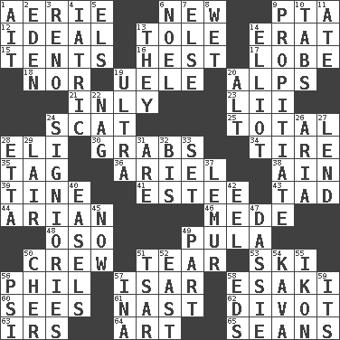 ACROSS 1. Nest on high 6. ___ Haven, CT 9. Parent Teacher Assoc. 12. Perfect 13. Lacquered or enameled metalware 14. Part of Q.E.F. 15. Portable shelters 16. Behest 17. Ear part 18. Or not 19. Ubangi River tributary 20. High mountains 21. Inwardly 23. Cards in a Roman deck? 24. Scram! 25. Add up to 28. Biblical high priest 30. Takes hold of 34. Become fatigued 35. Label 36. Satellite of Uranus 38. The 18th letter of the Arabic alphabet 39. Prong on a fork 41. First name in cosmetics 43. Small boy 44. Believer in; advocate of (suffix) 46. Ancient Persian 48. Bear (Spanish) 49. Monetary unit of Botswana 50. Ship's personnel 51. Rend 53. What Jean-Claude Killy likes to do 56. Silvers or Donahue 57. Austrian river, tributary to the Danube 58. 1973 Nobel Price Winner (Physics) Leo 60. Observes 61. Political cartoonist Thomas 62. A piece of turf (Scot.) 63. Big collection agency 64. Tate display 65. Seines DOWN 1. Small island 2. Paradise 3. Western Nevada city 4. Of or pertaining to medicine 5. Raised railways 6. Christmas carol 7. Otherwise 8. Soggy 9. Conciliate 10. Bar bills 11. Had dinner 13. Those things 14. American author Paul (1891-1958) 19. Extremist 20. The first octave above the treble staff 22. Tired old horse 24. Seigniories (variant) 26. Operatic vocal solo 27. Grant temporary use of 28. Singer James 29. Den 31. "We ___ not amused" (Victoria) 32. Altar cloth linen 33. Arrange properly for use 37. Arboreal primate 40. Artist's stands 42. Snakelike fish 45. Immediately 47. Hyrax 49. Role in a play 50. "Mermaids" star 51. Russian ruler of old 52. 90 degrees 54. Polynesian shrub of the pepper family 55. Picture 56. Air pressure measure (abbr.) 57. _ tizzy (2 wds.) 58. Begley and Asner 59. It is