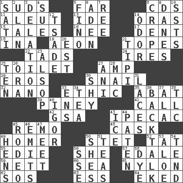 ACROSS 1. Soap bubbles 5. At a great distance 8. Music discs 11. Eskimo relative 13. Binary compound 14. Mouths or openings 15. Lies 16. Born 17. Gouge 18. _ tizzy (2 wds.) 19. Age 21. Drinks excessively 22. Small amounts or degrees 24. Angers 25. Bathroom plumbing fixture 27. Electrical Unit 29. Greek god of love 30. Slow-paced one 32. Billionth: prefix 33. Principle of right and wrong 35. Blind as ____ 39. Abounding in pines 41. Give a ring to 42. Girls' org. (abbr.) 43. Medicinal drug used to evoke vomiting 45. San ____ (Riviera town) 48. Keg 49. Baseball hit which scores a run 50. Proofreading order 52. Make lace 55. Singer Brickell 56. A female animal or person 57. Peak District village in England 59. Remaining after all deductions 60. Ocean 61. Thermoplastic polyamide 62. Distress signal 63. Double-curved letter 64. Made supply last DOWN 1. Suttee (variant) 2. Uhlan (variant) 3. Accusation by an informer 4. Take to court 5. A pale, very dry sherry 6. An important port of Yemen 7. To riddle 8. Streamer paper 9. Natives or inhabitants of Denmark 10. Fast planes 12. Sadhe (variant) 14. Aroma 20. Eastern Standard Time (abbr.) 21. Native american tent (variation) 23. Columnist Joseph or Stewart 25. Nine, plus one 26. Mouth or opening 27. Cuckoo 28. Big _ 30. Like a shrinking violet 31. Shoestrings 33. Followers of ems 34. Beverage made from leaves 36. Sass 37. Wing 38. Affectionate concern, for short 40. Composer Stravinsky 43. Frozen water 44. Eucharist need 45. Cowboy competition 46. Sends forth 47. Rendezvous 49. Coop moms 50. "______ My Girl" (Turtles hit) 51. Afternoon social gatherings 53. Medicinal plant 54. Look after 56. Compass dir. 58. Color