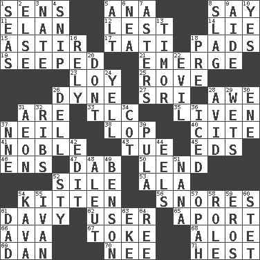 ACROSS 1. Elected reps. 5. Santa ___, CA 8. Declare 11. Flair 12. For fear that 14. Untruth 15. Having gotten out of bed 17. Jacques of French films 18. Groovy apts. 19. Oozed 21. Develop 23. Myrna of the movies 25. Be footloose 26. Unit of force 27. Indian title of respect (Mr.) 28. Deep reverence 31. "We ___ not amused" (Victoria) 33. Affectionate concern, for short 35. Make or become more lively 37. Famous astronaut Armstrong 38. Chop off 40. Quote 41. Impressive in appearance 43. Third day of the wk. 45. Begley and Asner 46. Followers of ems 47. Small moist lump or mass 50. Grant temporary use of 52. Filth; sediment 53. According to 54. Baby cat 56. Sounds asleep 61. _ Jones' Locker 62. One who uses or employs something 65. To the left, to Queeg 66. Actress Gardner 67. Casino tip 68. Medicinal plant 69. One of the 12 tribes of Israel 70. Born 71. Command DOWN 1. Oceans 2. Otherwise 3. Nathan's nickname 4. Clip 5. Keyboard modifier key 6. Teachers' org. 7. Michaelmas daisies 8. Volcanic refuse 9. Helper 10. It is so 13. Southeast Indonesia island 16. Have confidence or faith in 18. Before (prefix) 20. Do not 22. Tending to cause great harm 24. Shout 26. Small valley 28. Enthusiastic 29. Moistens 30. Compass dir. 31. A really long time 32. Teases 34. Small bed 36. On the rocks 37. Compass dir. 39. Monetary unit of Botswana 42. Prepare for publication 44. Snakelike fish 48. Native American of Southwest Alaska 49. Gillaume's butler role 51. Nanny 52. Filthy place 54. Polynesian shrub of the pepper family 55. _ the terrible 57. Brightly colored fish 58. Hero or heavy, e.g. 59. Greek god of love 60. Proofreading order 61. June honoree 63. Make supply last 64. To riddle
