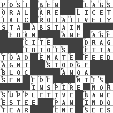 ACROSS 1. Mail 5. Benjamin's nick name 8. Fails to keep up a pace 12. Taken by mouth 13. "We ___ not amused" (Victoria) 14. It is permitted: Lat. 15. Baby powder 16. Producing rotation 19. R.R. building 20. Refrain by choice 21. Dutch treat 23. A saturated hydrocarbon 24. Personal question 27. Quote 30. To trail on the ground 31. Foolish or stupid persons 34. Singer James 35. Frog relative 38. Maternal 40. Nourish 41. Hindu god of fire 42. Moe Howard, for one 44. Group of countries in special alliance 45. Small Philippine buffalo 46. Elected rep. 47. Enemy 50. Nuclear Threat Initiatives 53. Motivate 57. Not either 59. Supplying deficiencies 63. Object of repulsion 64. First name in cosmetics 65. Baking dish 66. Southeast Asian peninsula 67. Rend 68. Compass dir. 69. Observes DOWN 1. Cooking vessels 2. Declaim 3. First course 4. Affectionate concern, for short 5. Sharp remark 6. Greek god of love 7. Remaining after all deductions 8. 54 in ancient Rome 9. Adept person 10. Set 11. Filthy place 14. Actor's bit 17. American Automobile Association (abbr.) 18. Metal container 20. Among 22. Being or containing an acid 24. Johnson of "Laugh-In" 25. Yard entry 26. Mild oath 28. Standoff 29. Immeasurably long periods of time 30. Outscore 32. Make lace 33. Portico 35. Bar bills 36. Stare at amorously 37. At once, immediately (arch.) 39. Period of immesurable duration 43. Went 47. Do some clerical work 48. Single 49. Eastern Standard Time (abbr.) 51. Silly 52. Message 54. Corncob 55. _ the terrible 56. French philosopher Descartes 58. Vintage cars 59. Put into a specified state 60. Purpose 61. Parent Teacher Assoc. 62. For each 63. Twice