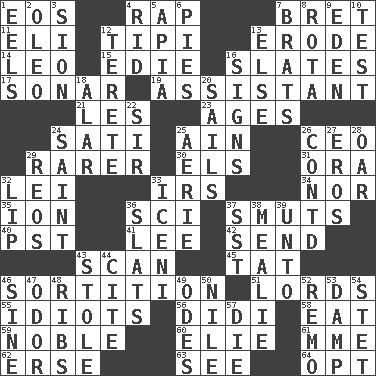 ACROSS 1. Greek goddess of the dawn 4. Reproach for some lapse or misdeed 7. Cy Young winner Saberhagen 11. Connecticut Ivy Leaguer 12. Native american tent (variation) 13. Eat (away) 14. Lion 15. Singer Brickell 16. Chalkboards 17. Underwater navigation system 19. Helper 21. French article 23. Eras 24. Suttee (variant) 25. The 18th letter of the Arabic alphabet 26. Corporate head (abbr.) 29. More valued for its uncommonness 30. Raised railways 31. Mouth or opening 32. Luau accessory 33. Big collection agency 34. Not either 35. Electrically charged atom 36. _-fi 37. Obscenities 40. Pacific Standard Time (abbr.) 41. Area sheltered from the wind 42. Transmit 43. Examine hastily 45. Make lace 46. Decision 51. Nobles 55. Foolish or stupid persons 56. "You Light Up My Life" star Conn 58. Consume 59. Having high moral qualities 60. Writer Wiesel 61. Madame (abbr.) 62. Celtic language 63. Observe 64. Elect DOWN 1. Snakelike fish 2. Margarine 3. The Jewish people; Israel 4. To free from 5. Capital of Western Samoa 6. Sliced desserts 7. Naughty children 8. Round or rotation of duties 9. Genesis locale 10. Trial 12. Cigar-shaped 13. Otherwise 16. Omens 18. Having or resembling wings 20. Moves on water 22. Title for a knight 24. Virtuous person 25. Nest on high 26. Continued (abbr.) 27. Greek god of love 28. Rowing implement 29. Vintage cars 32. Mouth edge 33. Ancient Celtic tribe of eastern Britain 36. Narrow boards 37. Fast jet (abbr.) 38. Ear of corn 39. To (old English) 43. Took without asking 44. Quote 46. Trig term 47. Scent 48. Chest bones 49. Lyric poems 50. "Death on the ____" 52. San ____ (Riviera town) 53. Moist 54. Proofreading order 57. Pass on