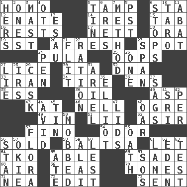 ACROSS 1. Like (prefix) 5. Pack (down) 9. R.R. building 12. Maternal 14. Angers 15. Keyboard key 16. Musical pauses 17. Remaining after all deductions 18. Mouth or opening 19. Fast jet (abbr.) 20. Anew 23. Blemish 24. Monetary unit of Botswana 25. I made a mistake 27. Louse (plural) 30. Call ___ day 32. Heredity factor (abbr.) 33. SW Asia republic 34. Hoop that covers a wheel 36. Followers of ems 38. Double-curved letter 39. Petroleum 40. Cleo's killer 43. Krazy ___ of comics 46. 1994 drama film starring Jodie Foster 48. Legendary monster 49. Zeal 51. Cards in a Roman deck? 52. SW Saudi Arabia district 53. A pale, very dry sherry 54. Aroma 56. Disposed of to a purchaser 58. Greek mezzo-soprano Agnes 61. Allow 64. Ring climax 65. Competent 66. Sadhe (variant) 68. Atmosphere 69. Afternoon social gatherings 70. Dwellings 71. Teachers' org. 72. Prepare for publication 73. Emitted DOWN 1. Possessive pronoun 2. Singles 3. Vertical spar for supporting sails 4. Baseball player Mel 5. Prong on a fork 6. Ancient Greek god of war 7. Mode 8. Pacific Standard Time (abbr.) 9. Ceases 10. Pacific island yam 11. Blind as ____ 13. He sold his birthright 21. Sudden quick movement 22. Food allowance for one day 23. Connect, as a bridge 24. Fenced enclosure 26. Single 27. Whopper 28. Big collection agency 29. Keg 31. Satellite of Uranus 35. American author Paul (1891-1958) 37. Droops 41. _ Lanka 42. For each 44. Enthusiastic 45. Metal container 47. Hats (slang) 48. Rowing implement 50. Crowded into 53. Plants 55. Pledge 56. Comedian Laurel of Laurel & Hardy 57. Migrant worker of the '30s 59. Jai _ 60. For fear that 61. Unable to walk 62. Genesis locale 63. Trial 65. Had dinner 67. Mayday