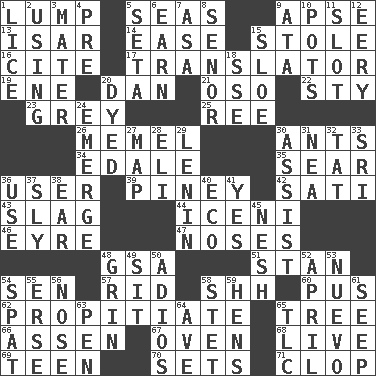 ACROSS 1. Mass 5. Oceans 9. Domed church section 13. Austrian river, tributary to the Danube 14. Relaxation 15. Fur scarf 16. Quote 17. Interpreter 19. Compass dir. 20. One of the 12 tribes of Israel 21. Bear (Spanish) 22. Filthy place 23. Jennifer or Joel 25. To separate or throw off 26. Klaipeda city 30. Pismires 34. Peak District village in England 35. Burn superficially 36. One who makes use of a thing 39. Abounding in pines 42. Suttee (variant) 43. Volcanic refuse 44. Ancient Celtic tribe of eastern Britain 46. Jane of fiction 47. Olfactory organs 48. Girls' org. (abbr.) 51. Comedian Laurel of Laurel & Hardy 54. Elected rep. 57. To free from 58. Quiet! 60. Tenth month of the Hindu calendar 62. Appease 65. Family _ (genealogy) 66. NE Netherlands city 67. Baking chamber 68. Moving, as bait 69. Adolescent 70. Puts into a specified state 71. Hoof sound DOWN 1. Louse (plural) 2. Putting into practice 3. Mother 4. Before (prefix) 5. Bristle 6. Merit 7. White ___ sheet 8. Sir (Sp.) 9. _ moment's notice (2 wds.) 10. Plant holders 11. Slit 12. Suggestive of the supernatural 15. _ gin 18. Compass dir. 20. Colored 24. Develop 27. Atlas unit 28. Connecticut Ivy Leaguer 29. Soviet premier 1918-24 30. Help 31. Teachers' org. 32. Make lace 33. _ Lanka 36. Purpose 37. Wily 38. Ewer handle 40. Environmental prefix 41. Consenting reply 45. Tender 48. Smile widely 49. Be seated 50. Goodbye (Sp.) 52. Showery time 53. New (sp.) 54. Petty quarrel 55. Celtic language 56. Sense of smell 58. Proofreading order 59. Coop moms 61. Ooze 63. Animal enclosure 64. "___ Maria" 65. Affectionate concern, for short