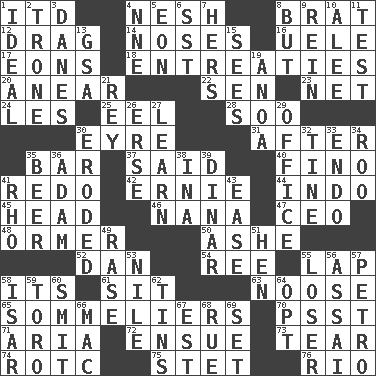ACROSS 1. It would 4. Tender 8. Naughty child 12. To draw with force 14. Olfactory organs 16. Ubangi River tributary 17. Immeasurably long periods of time 18. Pleas 20. Approach 22. Elected rep. 23. Fish or hair follower 24. French article 25. Snakelike fish 28. "Barney Miller" actor Jack 30. Jane of fiction 31. Following 35. Long, evenly shaped piece 37. Alleged 40. A pale, very dry sherry 41. Make new 42. Bert's buddy 44. _ china 45. Froth on beer 46. Nanny 47. Corporate head (abbr.) 48. Channel Islands abalone 50. American tennis player Robert 52. One of the 12 tribes of Israel 54. To sift 55. Infant locale 58. ___ a Wonderful Life 61. Be seated 63. Trap for birds or small mammals 65. Wine waiters 70. Inconspicuous attention getter 71. Operatic vocal solo 72. Take place subsequently 73. Rend 74. College mil. group 75. Proofreading order 76. _ de Janeiro DOWN 1. Perfect 2. Heavy duty weighing machine 3. Natives or inhabitants of Denmark 4. Compass dir. 5. Period of immesurable duration 6. Fast jet (abbr.) 7. Possessive pronoun 8. On the contrary 9. It's straight from the horse's mouth 10. Toward shelter 11. Trial 13. Girls' org. (abbr.) 15. Observes 19. Small Philippine buffalo 21. Marina Del _, California 26. Celtic language 27. Acquire or gain knowledge or skills 29. Public position 30. Worn away 32. Prong on a fork 33. Inside; within (prefix) 34. Friend of Pooh 35. Fermented drink made from hops 36. First man 38. _ tizzy (2 wds.) 39. Middle Eastern gold or silver currency 41. 17th letter of the Greek alphabet 43. Relaxation 49. Raze (variant) 51. Layer 53. Mediterranean tributary 55. Failure 56. Slender Brazilian palm 57. Stone: prefix 58. Austrian river, tributary to the Danube 59. "Corrida" creature 60. Stricken, poetically 62. Metal containers 64. Elect 66. Big _ 67. Eastern Standard Time (abbr.) 68. Sorrow 69. Put into a specified state