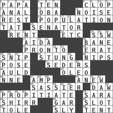 ACROSS 1. Dad 5. Nine, plus one 8. Hoof sound 12. Of or related to the anus 13. Chief or king in Benin or Nigeria 14. Annoying sound 15. Take ten 16. Census information 19. Make lace 20. Legislator 21. Monthly bill 23. And so on (abbr.) 24. Compass dir. 27. Opera by Verdi 30. Object of repulsion 31. Right away 34. Part of Q.E.F. 35. Sever or remove by pinching or nipping 38. Feeling sharp psychological pain 40. Pinches, bites 41. Airs 42. Spring feasts 44. Old (Scot.) 45. Margarine 46. Compass dir. 47. Electrical Unit 50. Afresh 53. More lively and spirited 57. Simpleton 59. Appease 63. "Two Mules for Sister ____" 64. Bake eggs in their shells 65. Slender fish 66. Position in a hierarchy or organization 67. Lacquered or enameled metalware 68. Cunning 69. Portable shelter DOWN 1. Component 2. Approach 3. Thick mixture 4. Keyboard modifier key 5. Drink excessively 6. Inky black, to poets 7. California wine valley 8. Small bed 9. Cards in a Roman deck? 10. Bear (Spanish) 11. Animal enclosure 14. Drug cop 17. Shoshoni 18. Car dealer's back yard 20. Commotion 22. Slept 24. Indian skirt 25. Fastener 26. Moistens 28. Two (Sp.) 29. Pismires 30. Gillaume's butler role 32. Third day of the wk. 33. Southwest Nigerian state 35. Connect, as a bridge 36. Part of speech 37. Capri or Wright 39. Set 43. Tail end 47. SW Saudi Arabia district 48. Floor protector 49. 23rd letter of the Greek alphabet 51. Peak District village in England 52. Make _____ (do battle with) 54. Settles 55. Slanted text style (abbr.) 56. Suggestive of the supernatural 58. Electrical Unit 59. Pacific Standard Time (abbr.) 60. 17th letter of the Greek alphabet 61. Lubricate 62. Before (prefix) 63. Fast jet (abbr.)