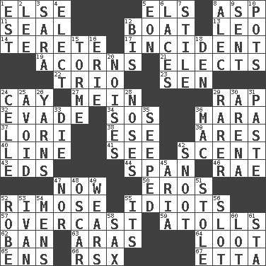 ACROSS 1. Otherwise 5. Raised railways 8. Cleo's killer 11. Lick closed 12. Water vessel 13. Lion 14. Cigar-shaped 17. Event 19. Oak nuts 21. Chooses 22. Musical group of three 23. Elected rep. 24. Island 27. Count _ (2 wds.) 29. Reproach for some lapse or misdeed 32. Dodge 34. Mayday 36. Hindu Mythology: god of death 37. Australian parrot (variant) 38. Compass dir. 39. Ancient Greek god of war 40. Actor's bit 41. Observe 42. Aroma 43. Begley and Asner 44. Connect, as a bridge 46. Actress Charlotte 47. At this time 50. Greek god of love 52. Full of chinks, cracks, or crevices 55. Foolish or stupid persons 57. Cloudy 59. Ringlike coral islands and reefs 62. Forbid 63. Ancient river in northeast Turkey 64. Spoils 65. Followers of ems 66. Acura sports coupe 67. Singer James DOWN 1. Eastern Standard Time (abbr.) 2. Area sheltered from the wind 3. "Two Mules for Sister ____" 4. Choose 5. Period of immesurable duration 6. Shoestrings 7. Vertical member of a panel or frame 8. Actor Baldwin 9. Emitted 10. Plant holders 12. Altar cloth linen 15. Singer Mel 16. One of the Great Lakes 18. Lair 20. Annoying sounds 24. Cell (Danish) 25. Prevent the occurrence of 26. Tall tales 28. Olfactory organs 29. More valued for its uncommonness 30. Sports stadium 31. Thick mixture 33. Expire 35. Oozed 36. Big _ 42. Snob 45. Roberta Peters solo 47. Not either 48. Motion picture award 49. Erodes 51. Took without asking 52. Loose flowing garment 53. "Terrible" tsar 54. Not women's 55. ___ a Wonderful Life 56. Position in a hierarchy or organization 58. Saxophone 60. Car dealer's back yard 61. R.R. building