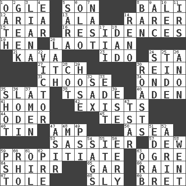 ACROSS 1. Stare at amorously 5. Manchild 8. Indonesian resort city 12. Operatic vocal solo 13. According to 14. More uncommon 15. Separate forcefully 16. Homes 19. Layer 20. Of or relating to Laos or its people 21. Polynesian shrub of the pepper family 23. Wedding promise 24. R.R. building 27. Hankering 30. It's straight from the horse's mouth 31. Elect 34. Southwest Nigerian state 35. Narrow board 38. Sadhe (variant) 40. An important port of Yemen 41. Like (prefix) 42. Is 44. Baltic tributary 45. Trial 46. Metal container 47. Electrical Unit 50. Toward the sea 53. More lively and spirited 57. Morning condensation 59. Appease 63. Legendary monster 64. Bake eggs in their shells 65. Slender fish 66. Water falling in drops from the sky 67. Lacquered or enameled metalware 68. Stealthy 69. Cy Young winner Saberhagen DOWN 1. Pledge 2. Of Greece 3. Woody, climbing, usually tropical plant 4. Hearing organ 5. "Two Mules for Sister ____" 6. Margarine 7. Political cartoonist Thomas 8. Prohibit 9. Curve 10. Area sheltered from the wind 11. Big collection agency 14. Western Nevada city 17. One more than two 18. Male parent 20. Thin strip of wood or metal 22. Winning man's name 24. Post 25. Event that recurs at intervals 26. At once, immediately (arch.) 28. Small bed 29. Stockings 30. Ridicules or criticizes harshly 32. Saxophone 33. Prepare for publication 35. Guess 36. Farming town in central California 37. So be it 39. Compass dir. 43. Russian ruler of old 47. SW Saudi Arabia district 48. Floor protector 49. Air pressure measure (abbr.) 51. _ Allan Poe 52. Nest on high 54. Sinks 55. Slanted text style (abbr.) 56. Suggestive of the supernatural 58. Gone 59. Pacific Standard Time (abbr.) 60. 17th letter of the Greek alphabet 61. Petroleum 62. Before (prefix) 63. Globe