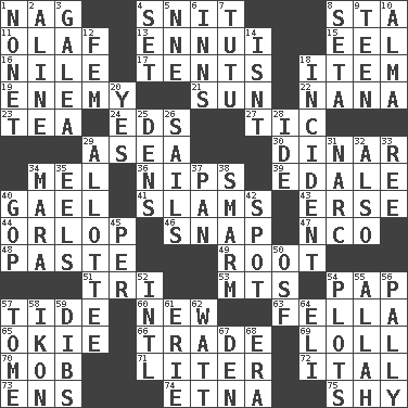 ACROSS 1. Tired old horse 4. In a ____ (agitated or irritated) 8. R.R. building 11. Norwegian king 13. World-weariness 15. Snakelike fish 16. "Death on the ____" 17. Portable shelters 18. A whole individual unit 19. Foe 21. Player for Phoenix 22. Grandmother 23. Afternoon social gathering 24. Begley and Asner 27. Nervous spasm 29. At sea 30. Middle Eastern gold or silver currency 34. Cartoonist voice _ Blanc 36. Cuts off 39. Peak District village in England 40. Highlander 41. Shuts with force 43. Celtic language 44. Fourth or lowest deck 46. Fastener 47. Non-commissioned officer (abbr.) 48. Thick mixture 49. Carrot, for example 51. Three (prefix) 53. Mountains (abbr.) 54. Infant food 57. Event that recurs at intervals 60. ___ Haven, CT 63. Man or boy (slang) 65. Migrant worker of the '30s 66. Exchange 69. Hang loosely or laxly 70. Disorderly crowd 71. 61 cubic inches 72. Slanted text style (abbr.) 73. Followers of ems 74. Inactive volcano in Sicily 75. Like a shrinking violet DOWN 1. Music written for nine 2. Place in a line 3. An organ shaped like a helmet 4. Put into a specified state 5. Compass dir. 6. Taverns 7. Ballerina skirt 8. Stalk of a moss capsule 9. Adolescent 10. _ mater 12. Opposite of masc. 14. Is not 18. Event 20. Consenting reply 25. Cub Scout units 26. Travel by water 28. Binary compound 29. One to whom something is allotted 31. Drug cop 32. In addition 33. Portuguese money of account (variant) 34. Hindu Mythology: god of death 35. Snakelike fish 37. Baking dish 38. Excessive but superficial compliments 40. Republican Party 42. Blemish 45. For each 50. Order of Saint Francis (abbr.) 52. International (abbr.) 54. Ground plans 55. Assad's deity 56. Chummy 57. Heavy book 58. Image 59. Rights 61. One of the Great Lakes 62. Electrical Unit 64. Biblical high priest 67. Lair 68. Epoch