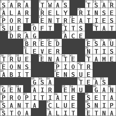 ACROSS 1. "Two Mules for Sister ____" 5. It was, poetically 9. Russian ruler of old 13. Having or resembling wings 14. Have trust in 15. Remove soap 16. Left side of a ship or aircraft 17. Pleas 19. Institute legal proceedings 20. Often (poetically) 21. It is 22. Make lace 23. To be drawn or hauled along 25. Adept person 26. A special lineage 30. Son of Isaac 34. Crowbar 35. Nuclear Threat Initiatives 36. Loyal 39. Related on the mother's side 42. Not wild 43. Immeasurably long periods of time 44. Peter (Polish) 46. "This won't hurt ____!" 47. Take place subsequently 48. Girls' org. (abbr.) 51. Beverages made from leaves 54. Commissioned military rank (abbr.) 57. Wind 58. Australian flightless bird 60. Separate the seeds from cotton 62. Conciliate 65. Stalk of a moss capsule 66. Before Barbara or Clara 67. A slight indication 68. Sever or remove by pinching or nipping 69. Portico 70. Came down and settled, as after flight 71. Inactive volcano in Sicily DOWN 1. Plant excrements 2. Verbally 3. Less widely known 4. Tate display 5. Unclean, religiously 6. Gone 7. The first octave above the treble staff 8. Damascus' land 9. Teat (slang) 10. In a ____ (agitated or irritated) 11. Toward the sea 12. Remainder 15. Raze (variant) 18. And so on (abbr.) 20. Legendary monster 24. Most capable 27. First lady 28. Car or cant ending 29. Window treatment 30. Main course 31. R.R. building 32. Direct toward a target or goal 33. Purpose 36. Afternoon social gathering 37. Director Reiner 38. University (slang) 40. Shallow baking pan 41. Greek goddess of the dawn 45. Ballerina skirt 48. Greek goddess of the earth (variant) 49. Be seated 50. N. Chile seaport 52. Rep 53. Smooth fabric 54. Global Positioning Systems (abbr.) 55. Part of Q.E.F. 56. Words to Nanette 58. Needle case 59. Rendezvous 61. California wine valley 63. Parent Teacher Assoc. 64. 100% 65. Compass dir.