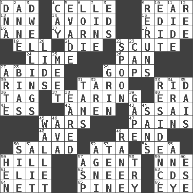 ACROSS 1. Male parent 4. Cell (Danish) 9. Rump 13. Compass dir. 14. Stay clear from 15. Singer Brickell 16. A saturated hydrocarbon 17. Tall tales 18. Travel on an animal 19. Pipe bend 21. Pass on 22. Turtle shell scale 24. Welles in "The Third Man" 26. Baking dish 27. Tolerate 29. Republicans 30. Remove soap 31. Pacific island yam 33. To free from 36. Label 37. Separating forcefully 40. Period 41. Double-curved letter 42. So be it 43. Slender Brazilian palm 45. Armed conflicts 47. Aches 48. "___ Maria" 49. Tear apart 50. First course 52. _ moment's notice (2 wds.) 54. Ocean 56. Land elevation 57. Rep 59. Compass dir. 61. Writer Wiesel 62. Scornful expression 63. Music discs 64. Remaining after all deductions 65. Abounding in pines 66. Sight organ DOWN 1. Heredity factor (abbr.) 2. Queen of England 1702-14 3. Homes 4. Island 5. Dodge 6. Australian parrot (variant) 7. Actor's bit 8. Begley and Asner 9. Summer TV shows 10. Prepare for publication 11. Helper 12. To sift 20. Hats (slang) 22. Soup utensil 23. Head covering 25. Rendezvous 27. Johnson of "Laugh-In" 28. Prejudice 29. Smile widely 31. Scottish caps 32. "We ___ not amused" (Victoria) 33. Dwelling 34. SW Asia republic 35. Raised platform 38. Having ears or earlike features 39. Stare wonderingly 44. Without 45. Place for singles 46. Actress Gardner 49. The wife of a rajah (variant) 50. Drop; flow; fall 51. Came down and settled, as after flight 52. Hindu god of fire 53. Adolescent 55. "60 Minutes" Commentator Rooney 56. Layer 57. Cleo's killer 58. Attempt to accomplish something 60. Compass dir.