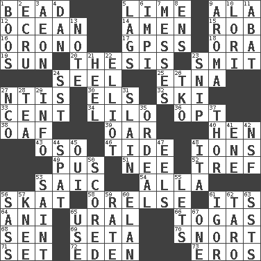 ACROSS 1. Necklace unit 5. Welles in "The Third Man" 9. Insect wing 12. Sea 14. So be it 15. Director Reiner 16. U. of Maine site 17. Global Positioning Systems (abbr.) 18. Mouth or opening 19. Player for Phoenix 20. College paper 23. Stricken, poetically 24. Stitch closed the eyes of (a falcon) 25. Inactive volcano in Sicily 27. Nuclear Threat Initiatives 30. Raised railways 32. What Jean-Claude Killy likes to do 33. Penny 34. _ and Stitch 36. Elect 38. Clumsy lout 39. Boat paddle 40. Layer 43. Bear (Spanish) 46. Periodic rise and fall of the sea level 48. Charged particles 49. Tenth month of the Hindu calendar 51. Born 52. Unclean, religiously 53. Ketch in the Levant 54. Silent film actress Nazimova 56. Three-handed card game 58. Threatening words 61. It is 64. Cuckoo 65. Mountain range 66. Ancient Roman robes 68. Elected rep. 69. Bristle 70. Derisive sound 71. Arrange properly for use 72. Genesis locale 73. Greek god of love DOWN 1. Expressions of contempt or scorn 2. Shade of tan 3. Age 4. Daniel's nick name 5. Straggles 6. Body of Kaffir warriors 7. Makes clutter 8. Followers of ems 9. Scent 10. Australian parrot (variant) 11. Blind as ____ 13. Brief written record 21. Person who is morally reprehensible 22. American author Paul (1891-1958) 23. Clip 24. Fast jet (abbr.) 26. Ring climax 27. Non-commissioned officer (abbr.) 28. Afternoon social gathering 29. A message received and understood 31. Killed 35. Severe or trying experience 37. Son of Odin 41. Compass dir. 42. Overdraft (abbr.) 44. Argument over a trivial matter 45. Fr. "Yes" 47. Snakelike fish 48. Call ___ day 50. Tallied 53. Virtuous person 55. Allows 56. Backtalk 57. Leg joint 59. Assign a rank or rating to 60. Enthusiasm 61. Russian composer Stravinsky 62. Edible starchy tuberous root 63. Fast planes 65. Purpose 67. Single