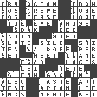 ACROSS 1. Epoch 4. Sea 9. Inky black, to poets 13. Mayday 14. Streamer paper 15. Ear part 16. Greek goddess of the dawn 17. Laconic 18. Spoils 19. Standoff 21. Sight organ 22. Get up 24. Neighbor of Neb. 26. Corporate head (abbr.) 27. Smooth fabric 29. Proofreading order 30. Chalkboard 31. Grain storage tower 33. _ Lanka 36. "___ Little Indians" 37. Apple salad 40. For each 41. Arrange properly for use 42. Confront 43. Empty; void 45. Mild oath 47. Shoestrings 48. Flowery wreath 49. Wig 50. American astronaut and politician John 52. E Mali city 54. She-sheep 56. Actor Baldwin 57. Clothes sense 59. Tate display 61. Portable shelter 62. Bee-related 63. Whopper 64. Conclusions 65. Haggard of country music 66. Dry husk or covering DOWN 1. Compass dir. 2. Carrot, for example 3. Aide 4. Sep. follower 5. Small stream 6. Suggestive of the supernatural 7. Domed church section 8. Born 9. American author Paul (1891-1958) 10. Expressions of contempt or scorn 11. Mitch Miller's instrument 12. Fish or hair follower 20. Prepare for publication 22. Thespian 23. To separate or throw off 25. Afresh 27. Fast planes 28. Toward shelter 29. Groove 31. Downhill vehicle 32. Binary compound 33. High altitude stroll 34. French philosopher Descartes 35. Angers 38. At full speed 39. Do some clerical work 44. Nathan's nickname 45. Chooses 46. Commissioned military rank (abbr.) 49. "_____ Recall" 50. Small, secluded valley 51. Grant temporary use of 52. Yawn 53. SW Saudi Arabia district 55. One of the Great Lakes 56. Had dinner 57. Scottish cap 58. Compass dir. 60. John Ritter's dad