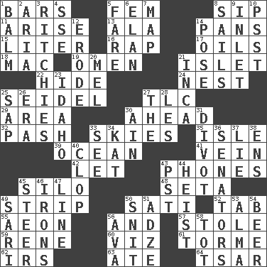 ACROSS 1. Long, evenly shaped pieces 5. Opposite of masc. 8. Small drink 11. Originate 13. Wing 14. Baking dishes 15. 61 cubic inches 16. Reproach for some lapse or misdeed 17. Lubricates 18. Big _ 19. Sign of things to come 21. Small island 22. Flintstone garb 24. A home for chicks 25. Beer mug 27. Affectionate concern, for short 29. Length times width 30. Toward the future 32. Romantic infatuation 33. Atmospheres 35. Capri or Wright 39. Sea 41. Distinctive style or manner 42. Allow 43. Gives a jingle 45. Grain storage tower 48. Bristle 49. Remove all contents or possession from 50. Suttee (variant) 52. Keyboard key 55. Period of immesurable duration 56. Added to 57. Fur scarf 59. French philosopher Descartes 60. To wit 61. Singer Mel 62. Big collection agency 63. Had dinner 64. Russian ruler of old DOWN 1. Lip ointment 2. Operatic vocal solo 3. Actors Guy, Robert Welles, and Clint 4. Compass dir. 5. Conductor's collection 6. Liveliness 7. Atlas unit 8. Moves on water 9. An arm off of a larger body of water 10. Inconspicuous attention getter 12. Eat (away) 14. Airs 20. Cartoonist voice _ Blanc 21. South American Indian 23. Potato state 25. Plant excrement 26. Epoch 27. Definite Article 28. French article 30. The 18th letter of the Arabic alphabet 31. A piece of turf (Scot.) 33. Observe 34. Krazy ___ of comics 36. Elected representatives 37. Untruth 38. Followers of ems 40. Hoof sound 43. Pacific Standard Time (abbr.) 44. Robbery 45. Bull 46. Removes the wrinkles 47. Actor's bit 49. Indian skirt 50. In a ____ (agitated or irritated) 51. Axlike tool, used for shaping wood 53. _ mater 54. Fermented drink made from hops 56. Actress Gardner 58. Small child