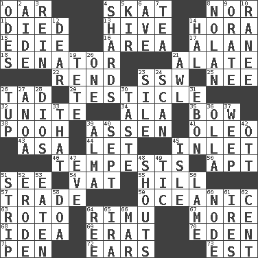 ACROSS 1. Rowing implement 4. Three-handed card game 8. Not either 11. Passed on 13. Hub of activity 14. Israeli folk dance 15. Singer Brickell 16. Length times width 17. Actor Alda or Thicke 18. Elected representative 21. Having winglike extensions 22. Tear apart 23. Compass dir. 25. Born 26. Small boy 29. One of the two male reproductive glands 32. Join together 34. Wing 35. Arrow shooter 38. "Silly old bear" 39. NE Netherlands city 41. Margarine 43. White ___ sheet 44. Allow 45. An arm off of a larger body of water 46. Storms 50. Fitting 51. Observe 54. Large container 55. Land elevation 57. Buy and sell 59. Pertaining to the sea 63. Printing process, for short 64. Tall New Zealand timber tree 67. Greater amount 68. It may be bright or harebrained 69. Part of Q.E.F. 70. Paradise 71. Fenced enclosure 72. Hearing organs 73. Eastern Standard Time (abbr.) DOWN 1. Lyric poems 2. Assistant 3. It's straight from the horse's mouth 4. Pottery fragments 5. Apertif with cassis 6. "___ Maria" 7. Beverage made from leaves 8. Pitcher Ryan 9. Speak pompously 10. The wife of a rajah (variant) 12. Letter starter 14. Actor Linden 19. Wig 20. Single 21. Leather borer 23. Filth; sediment 24. Glance over 26. Uncastrated adult male sheep 27. Small Philippine buffalo 28. "Vaya con ____" 30. Clothes sense 31. Inky black, to poets 33. Not this but _ 36. Spanish pot 37. Shed a tear 39. _ mater 40. Back-to-school mo. 42. Baseball player Mel 45. Small island 47. First lady 48. Yells 49. Nervous spasm 51. Long narrow piece of something 52. Wear away 53. Consumed 56. Unable to walk 58. ___ good deed 60. Thickened enlargement 61. Angers 62. Penny 64. To sift 65. Lyricist Gershwin 66. Impair