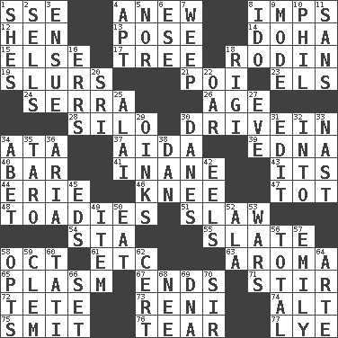 ACROSS 1. Compass dir. 4. Afresh 8. Naughty children 12. Layer 13. Introduce or present, as a question 14. Capital of the state of Qatar 15. Otherwise 17. Family _ (genealogy) 18. "The Thinker" sculptor 19. Runs notes together 21. Luau course 23. Raised railways 24. Spanish missionary in California 26. Personal question 28. Grain storage tower 30. Popular '50s hangout 34. _ moment's notice (2 wds.) 37. Opera by Verdi 39. Pulitzer Prize-winning author Ferber 40. Oblong piece of solid material 41. Silly 43. It is 44. 4th largest of the Great Lakes 46. Leg joint 47. Small child 48. Sycophants 51. Cole _ (cabbage dish) 54. R.R. building 55. Chalkboard 58. Sep. follower 61. And so on (abbr.) 63. Odor 65. Suffix with ecto or cyto 67. Conclusions 71. Move through with a circular motion 72. Wig 73. Painter Guido (1575-1642) 74. The first octave above the treble staff 75. Stricken, poetically 76. Separate forcefully 77. Sodium hydroxide DOWN 1. "______ My Girl" (Turtles hit) 2. Makes a sale 3. Take place subsequently 4. Fitting 5. And not 6. Compass dir. 7. Shed a tear 8. Wedding promise 9. Method 10. Silvers or Donahue 11. Without 16. Blunders 18. Swiss mountan, "Queen of the Mountains" 20. _ Lanka 22. Boat paddle 25. Mountain range southwest of Kyrgyzstan 27. First lady 29. Pig sounds 30. Natives or inhabitants of Denmark 31. Prepare for publication 32. To the inside or interior of 33. Political cartoonist Thomas 34. Collude with 35. Pacific island yam 36. Roberta Peters solo 38. One of the 12 tribes of Israel 42. Snakelike fish 45. Begley and Asner 49. A distinct part 50. Erode 52. Insect wing 53. Armed conflicts 56. Add up to 57. Poet Dickinson 58. Chooses 59. To starve (Brit.) 60. Jacques of French films 62. Sure thing 64. Johnson of "Laugh-In" 66. Put into a specified state 68. Born 69. Heredity factor (abbr.) 70. Title for a knight