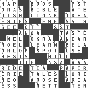 ACROSS 1. Atlas unit 4. Scornful sounds 8. Pacific Standard Time (abbr.) 11. Mouths or openings 13. God's Word 15. Had dinner 16. Food container 17. Anything that covers or conceals 18. The content of cognition 19. _____ Park, CO 21. She-sheep 22. Fast planes 23. Observe 24. Baseball player Mel 27. Fast jet (abbr.) 29. Small Philippine buffalo 30. Clothes sense 34. Cartoonist voice _ Blanc 36. Gumbo ingredient 39. Approach 40. Christmas carol 41. Acquire or gain knowledge or skills 43. Actor Lugosi 44. Fourth or lowest deck 46. Specific locale 47. Purpose 48. Musical pauses 49. Place where flour is made 51. Standoff 53. White ___ sheet 54. American Automobile Association (abbr.) 57. Travel on or in a vehicle 60. Afternoon social gathering 63. Some stationery 65. 4th largest of the Great Lakes 66. Lies 69. Australian parrot (variant) 70. Modern: prefix 71. Came up 72. Operatic vocal solo 73. Double-curved letter 74. Remaining after all deductions 75. "___ Little Indians" DOWN 1. Methods 2. Originate 3. Thick mixture 4. English channel? 5. Petroleum 6. Mitch Miller's instrument 7. Cole _ (cabbage dish) 8. Writing tablets 9. Proofreading order 10. Afternoon social gatherings 12. A female animal or person 14. Makes supply last 18. Byzantium, centuries later 20. Male child 25. Implement 26. Receives possession of 28. R.R. building 29. One to whom something is allotted 31. Perceives with the eye 32. Story 33. Period 34. Greater amount 35. Snakelike fish 37. Reproach for some lapse or misdeed 38. Scent 40. And not 42. Nuclear Threat Initiatives 45. 23rd letter of the Greek alphabet 50. Infant locale 52. Singer James 54. To the left, to Queeg 55. Nest on high 56. Believer in; advocate of (suffix) 57. French philosopher Descartes 58. Angers 59. "Vaya con ____" 61. Merit 62. _ vera 64. Insect wing 67. Eastern Standard Time (abbr.) 68. Put into a specified state