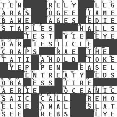 ACROSS 1. Nine, plus one 4. Trust 8. Part of a journey 11. Caspian sea tributary 13. Double curve, resembling the letter S 14. Not wild 15. Object of repulsion 16. Eons 17. Singer Brickell 18. Paper fasteners 21. Promenades 22. Trial 23. Compete 25. Sight organ 26. Rowing implement 29. One of the two male reproductive glands 32. Dice game 34. Actress Charlotte 35. Definite Article 38. Jacques of French films 39. Hold, grip (Informal) 41. Casino tip 43. Slangy assent 44. Fenced enclosure 45. Artist's stand 46. Plea 50. Begley and Asner 51. Chief or king in Benin or Nigeria 54. Curvy letter 55. Hoop that covers a wheel 57. Nest on high 59. Pertaining to the sea 63. Ketch in the Levant 64. Give a ring to 67. San ____ (Riviera town) 68. Otherwise 69. Of or related to the anus 70. Narrow board 71. Perceive with the eye 72. Confederate soldiers (slang) 73. Sodium hydroxide DOWN 1. Bar bills 2. Part of Q.E.F. 3. Nanny 4. Exposes to great heat 5. Ovum 6. Area sheltered from the wind 7. It is so 8. Dipping utensil 9. Poet Dickinson 10. Honkers 12. Back-to-school mo. 14. Beverage made from leaves 19. Allows 20. Compass dir. 21. Cartoonist voice _ Blanc 23. Small bottle 24. On the rocks 26. Sep. follower 27. Like ___ of sunshine 28. Pace 30. Marketplace scale 31. Singer James 33. Corncob 36. Flexible conduit 37. Supplemented with great effort 39. Flats, for short 40. Possessive pronoun 42. Raised railways 45. Jane of fiction 47. Born 48. Ringlike coral islands and reefs 49. Nervous spasm 51. Fertile tracts in a desert 52. Memphis, Tenn. Street 53. Originate 56. Hearing organs 58. Frozen water 60. 1994 drama film starring Jodie Foster 61. "If ____ say so..." 62. ____ d'Azur (French Riviera) 64. Automobile 65. One (Scot) 66. Experiment locale