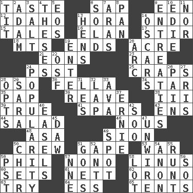 ACROSS 1. Clothes sense 6. Plant excrement 9. Car or cant ending 12. Potato state 13. Israeli folk dance 14. Southwest Nigerian state 15. Lies 16. Enthusiasm 17. Disorderly outburst 18. Mountains (abbr.) 19. Conclusions 20. Measure of real estate 21. Immeasurably long periods of time 23. Actress Charlotte 24. Inconspicuous attention getter 25. Dice game 28. Bear (Spanish) 30. Chap (slang) 34. Play the lead 35. Infant food 36. Rob, plunder, or pillage 38. One more than two 39. Loyal 41. Practice fights 43. Followers of ems 44. First course 46. Good sense 48. White ___ sheet 49. The Jewish people; Israel 50. Ship's personnel 51. Open wide 53. Armed conflict 56. Silvers or Donahue 57. Words to Nanette 58. "_ and Lucy" (Charlie Brown theme song) 60. Puts into a specified state 61. Remaining after all deductions 62. U. of Maine site 63. Attempt to accomplish something 64. Curvy letter 65. Portable shelters DOWN 1. Teat (slang) 2. First man 3. Table seasoning 4. College papers 5. Greek goddess of the dawn 6. Disposed of to a purchaser 7. Ancient river in northeast Turkey 8. Baking dish 9. Pleas 10. Singer Brickell 11. And not 13. Coop moms 14. Motion picture awards 19. Keyboard key 20. Curve 22. Order of Saint Francis (abbr.) 24. Teen's desire 26. Ache 27. Indian titles of respect 28. Elects 29. "Two Mules for Sister ____" 31. French article 32. Pet locale 33. Actress Gardner 37. Bert's buddy 40. Artist's stands 42. "Barney Miller" actor Jack 45. Fool 47. Undo the wiring of 49. Specific locale 50. "Mermaids" star 51. Moves 52. Pismires 54. At once, immediately (arch.) 55. The smallest animal of a litter 56. Pacific Standard Time (abbr.) 57. Compass dir. 58. Car dealer's back yard 59. Mayday