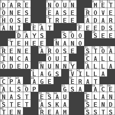 ACROSS 1. Have the gumption 5. Part of speech 9. Was introduced to 12. Washington bills 13. Comfort 14. Be footloose 15. Flexible conduit 16. Woody plant 17. The sixth month of the Jewish calendar 18. Cuckoo 19. Erode 21. Eats 22. 24-hour periods 24. "Barney Miller" actor Jack 26. Perceive with the eye 27. Giggle 28. Billionth: prefix 29. French philosopher Descartes 30. Came up 32. Portico 36. South American Indian 37. Fr. "Yes" 38. Give a ring to 39. Wrote a lyric poem 40. Pet term 42. Silent film actress Nazimova 43. Falls behind 44. Country residence 46. Accounting whiz (abbr.) 49. Grow older 50. Part of Q.E.F. 51. Columnist Joseph or Stewart 53. Girls' org. (abbr.) 54. Adept person 57. Political cartoonist Thomas 58. Son of Isaac 61. Flair 62. Proofreading order 63. "____ silly question..." 64. Post 65. Nine, plus one 66. 480, 500 or 516 sheets of paper 67. Fast planes DOWN 1. Capital of the state of Qatar 2. At once, immediately (arch.) 3. Dwelling 4. Compass dir. 5. Remaining after all deductions 6. Boat paddle 7. Purpose 8. Born 9. Methods 10. Dodge 11. Laconic 14. Actress Charlotte 19. Sight organ 20. Toward the sea 21. Egg _ yung 23. At or in the front 24. Indian antelope 25. Single 27. Look after 28. Parts of speech 29. _ de Janeiro 31. Makeup applied to the cheeks 32. Any of the three canals of the cochlea 33. Baron Munchausen's specialties 34. Spanish pot 35. Wing 40. Tired old horse 41. Jacques Cousteau's middle name 43. Pet locale 45. Retirement account (abbr.) 46. 2nd pers. sing. pres. of can (arch.) 47. Food holder 48. NE Netherlands city 52. Baseball player Mel 53. Island territory of the United States 55. Patter 56. Conclusions 58. Ewer handle 59. Compass dir. 60. Alias (abbr.) 61. Double-curved letter