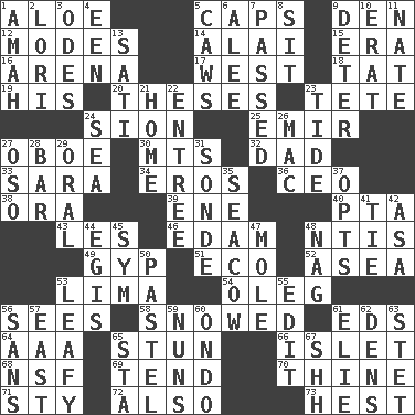 ACROSS 1. Medicinal plant 5. Smile enhancers 9. Lair 12. Methods 14. Jai ____ 15. Epoch 16. Sports stadium 17. 270 degrees 18. Make lace 19. Part of HMS, perhaps 20. College papers 23. False hair 24. The Jewish people; Israel 25. Independent ruler or chieftain 27. Mitch Miller's instrument 30. Mountains (abbr.) 32. Male parent 33. "Two Mules for Sister ____" 34. Greek god of love 36. Corporate head (abbr.) 38. Mouth or opening 39. Compass dir. 40. Parent Teacher Assoc. 43. French article 46. Dutch treat 48. Nuclear Threat Initiatives 49. Hustle 51. Environmental prefix 52. At sea 53. Pale green bean 54. Cassini of fashion 56. Observes 58. Frozen precipiation fell 61. Begley and Asner 64. Auto club (abbr.) 65. Astound 66. Small island 68. Overdraft (abbr.) 69. Watch over 70. One or ones belonging to thee 71. Filthy place 72. In addition 73. Command DOWN 1. Wet nurse 2. Australian parrot (variant) 3. Lyric poems 4. Car or cant ending 5. Crow sounds 6. Toward shelter 7. Went by 8. Be seated 9. Prevent from occurring 10. Part of Q.E.F. 11. Nathan's nickname 13. Suttee (variant) 21. Dwelling 22. Main course 23. Periodic rise and fall of the sea level 24. Ocean 26. Apple computer (short form) 27. Bear (Spanish) 28. Soap unit 29. Taken by mouth 31. Message 35. Manatee 37. Chooses 41. Make a knot 42. White ___ sheet 44. The front part of a cuirass 45. Symbol (abbr.) 47. Undercover agent 48. Tired old horse 50. Soft color 53. Like summer trees 55. Prepare for publication 56. Without 57. Compass direction 59. Religious women 60. Southwest Nigerian state 61. Writer Wiesel 62. Cub Scout units 63. Proofreading order 65. R.R. building 67. Quiet!
