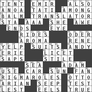 ACROSS 1. Portable shelter 5. Independent ruler or chieftain 9. In addition 13. Small Philippine buffalo 14. Jacques of French films 15. Amid 16. Lip ointment 17. Interpreter 19. R.R. building 20. Auto club (abbr.) 21. A female animal or person 22. Deep reverence 23. Conclusions 25. Sight organ 26. Amusement-park features 30. Baltic tributary 34. Odor 35. French philosopher Descartes 36. Sharp bark 39. Sets of matching outer garments 42. Actor Griffith 43. One of the Great Lakes 44. It is permitted: Lat. 46. Plant excrements 47. Vertical member of a panel or frame 48. Ocean 51. First of billions? 54. Purpose 57. Automobile 58. Player for Phoenix 60. Avid follower 62. Frustrating wastes of time 65. "Beetle Bailey" pooch 66. Believer in; advocate of (suffix) 67. Ooze 68. Trial 69. For fear that 70. Snakelike fish 71. Loyal DOWN 1. Bar bills 2. Related on the mother's side 3. Pitcher Ryan 4. Scottish cap 5. Singer James 6. Hindu Mythology: god of death 7. Call ___ day 8. Wash lightly 9. Wet nurse (var.) 10. Globular water bottle used in Asia 11. Overwhelm 12. Legendary monster 15. Toward shelter 18. Like a shrinking violet 20. SW Saudi Arabia district 24. Window treatments 27. Two (Sp.) 28. Australian flightless bird 29. Travel by water 30. Spoke pompously 31. Lair 32. Conclusion 33. Marina Del _, California 36. It is so 37. Epoch 38. Mouth edge 40. Teat (slang) 41. _-fi 45. Liveliness 48. Skim 49. Hearing organ 50. Came up 52. Following 53. Taiwanese island in East China Sea 54. Mountain range 55. The founder of a family 56. Armor plate that protects the chest 58. Stitch closed the eyes of (a falcon) 59. United States Postal Service (abbr.) 61. Observe 63. Floor protector 64. Area sheltered from the wind 65. Baseball player Mel