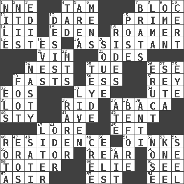ACROSS 1. Compass dir. 4. Scottish cap 7. Alliance 11. It would 12. Have the gumption 13. A-one 14. Cards in a Roman deck? 15. Paradise 16. Nomad 17. _____ Park, CO 19. Helper 21. Zeal 23. Lyric poems 24. Egg locale 25. Third day of the wk. 26. Compass dir. 29. Goes without food and/or water 30. Double-curved letter 31. Marina Del _, California 32. Greek goddess of the dawn 33. Sodium hydroxide 34. Shoshoni 35. Car dealer's back yard 36. To free from 37. Phillipine bananalike plant 40. Filthy place 41. "___ Maria" 42. Portable shelter 43. Old wives' tales, e.g. 45. Lizard (obsolete) 46. Dwelling 51. Pig sounds 55. Speaker 56. Bring up, as a child 58. Single 59. Carrier 60. Writer Wiesel 61. Perceive with the eye 62. SW Saudi Arabia district 63. Eastern Standard Time (abbr.) 64. Snakelike fish DOWN 1. Mediterranean tributary 2. Nuclear Threat Initiatives 3. Prepare for publication 4. Bit 5. Length times width 6. Not women's 7. Naughty children 8. Pale green bean 9. Sign of something about to happen 10. Certainty 12. Cease 13. Introduce or present, as a question 16. Amusement-park features 18. Nights before holidays 20. Lush 22. Mountains (abbr.) 24. Difficult 25. Miss Universe 1986, Barbara Palacios _ 26. Spew [out] 27. Bristle 28. Sight organ 29. Pick up the tab 32. Raised railways 33. Make or become more lively 36. More uncommon 37. Had dinner 38. Prior to 39. Opposed to 43. 61 cubic inches 44. Scent 46. Round or rotation of duties 47. Greek god of love 48. Suttee (variant) 49. Algonquian 50. Snakelike fish 52. Sense of smell 53. Leg joint 54. Stitch closed the eyes of (a falcon) 57. Small island