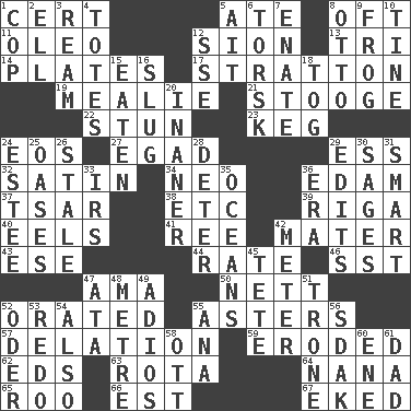 ACROSS 1. An absolute certainty 5. Had dinner 8. Often (poetically) 11. Butter sub 12. The Jewish people; Israel 13. Three (prefix) 14. Food holders 17. Ski resort town in Vermont 19. Ear of corn 21. Moe Howard, for one 22. Surprise greatly 23. Cask 24. Greek goddess of the dawn 27. Mild oath 29. Curvy letter 32. Smooth fabric 34. Modern: prefix 36. Dutch treat 37. Russian ruler of old 38. And so on (abbr.) 39. Capital of Latvia 40. Snakelike fish 41. To sift 42. Mother 43. Compass dir. 44. Pace 46. Fast jet (abbr.) 47. Wet nurse (var.) 50. Remaining after all deductions 52. Spoke pompously 55. Michaelmas daisies 57. Accusation by an informer 59. Worn away 62. Begley and Asner 63. Round or rotation of duties 64. Grandmother 65. Friend of Pooh 66. Eastern Standard Time (abbr.) 67. Supplemented with great effort DOWN 1. Police officer (slang) 2. Pipe bend 3. 480, 500 or 516 sheets of paper 4. Lugs 5. Small island 6. Cod relative 7. Related on the mother's side 8. "Beetle Bailey" pooch 9. Tree-dwelling hopper 10. Prong on a fork 12. Compass dir. 15. Eroded 16. Snaillike creature with no shell 18. Coat; cloak 20. More lacking in sense or substance 24. First name in cosmetics 25. Fertile tracts in a desert 26. Having lost freshness 28. Prevent from occurring 29. Prepares for publication 30. Gurus 31. Don Adams' spy role 33. Big collection agency 35. Seas 36. Epoch 42. Distance measurement 45. Wig 47. _ moment's notice (2 wds.) 48. Distance measurement (Brit.) 49. Goodbye (Sp.) 51. Marketplace scale 52. Baltic tributary 53. Do over again 54. In addition 55. Santa ___, CA 56. Neighbor of Neb. 58. Baseball player Mel 60. Compass dir. 61. June honoree