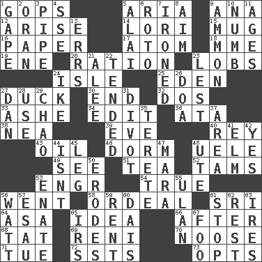 ACROSS 1. Republicans 5. Operatic vocal solo 9. Santa ___, CA 12. Get up 14. Australian parrot (variant) 15. Large cup 16. Some stationery 17. Smallest unit of an element 18. Madame (abbr.) 19. Compass dir. 20. Food allowance for one day 23. Tennis shots 24. Small island 25. Genesis locale 27. Evade 30. Conclude 32. Two (Sp.) 33. American tennis player Robert 34. Prepare for publication 36. _ moment's notice (2 wds.) 38. Teachers' org. 39. First lady 40. Marina Del _, California 43. Lubricate 46. Dormintory (informal) 48. Ubangi River tributary 49. Perceive with the eye 51. Beverage made from leaves 52. Scottish caps 53. Engineer (abbr.) 54. Loyal 56. Gone 58. Severe or trying experience 61. _ Lanka 64. White ___ sheet 65. The main thing one is thinking about 66. Following 68. Make lace 69. Painter Guido (1575-1642) 70. Trap for birds or small mammals 71. Third day of the wk. 72. Fast planes 73. Elects DOWN 1. Stare wonderingly 2. NW Algerian seaport 3. Corncob 4. Compass dir. 5. Mountain range southwest of Kyrgyzstan 6. Printing process, for short 7. Pressed 8. Direct toward a target or goal 9. ID or VA city 10. Unfeeling 11. Grows older 13. Blunders 21. Toward shelter 22. Watched over 23. For fear that 24. Mamie's husband 26. ___ good deed 27. One of the 12 tribes of Israel 28. Purpose 29. US Secretary of Labor Elaine L. _ 31. A piece of turf (Scot.) 35. Cylindrical with tapered ends 37. Length times width 41. Shade tree 42. Consenting reply 44. Is not 45. Part of a journey 47. Hindu Mythology: god of death 48. Shoshoni 50. Eats (away) 53. Maternal 55. ____ Bator 56. Electrical Unit 57. Son of Isaac 59. Monthly bill 60. Raised platform 61. Discontinue 62. Take ten 63. Angers 65. Big collection agency 67. Egg _ yung